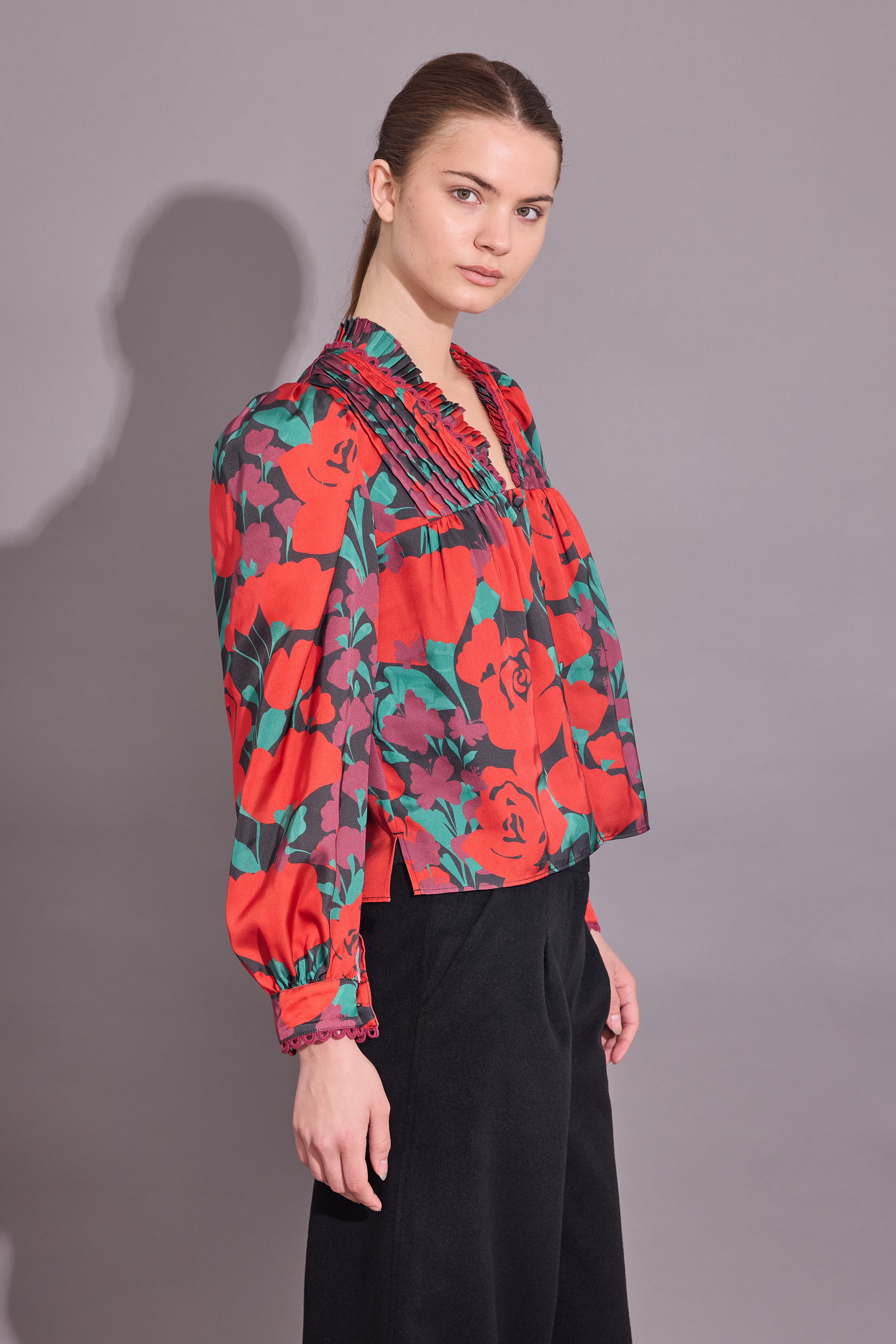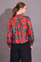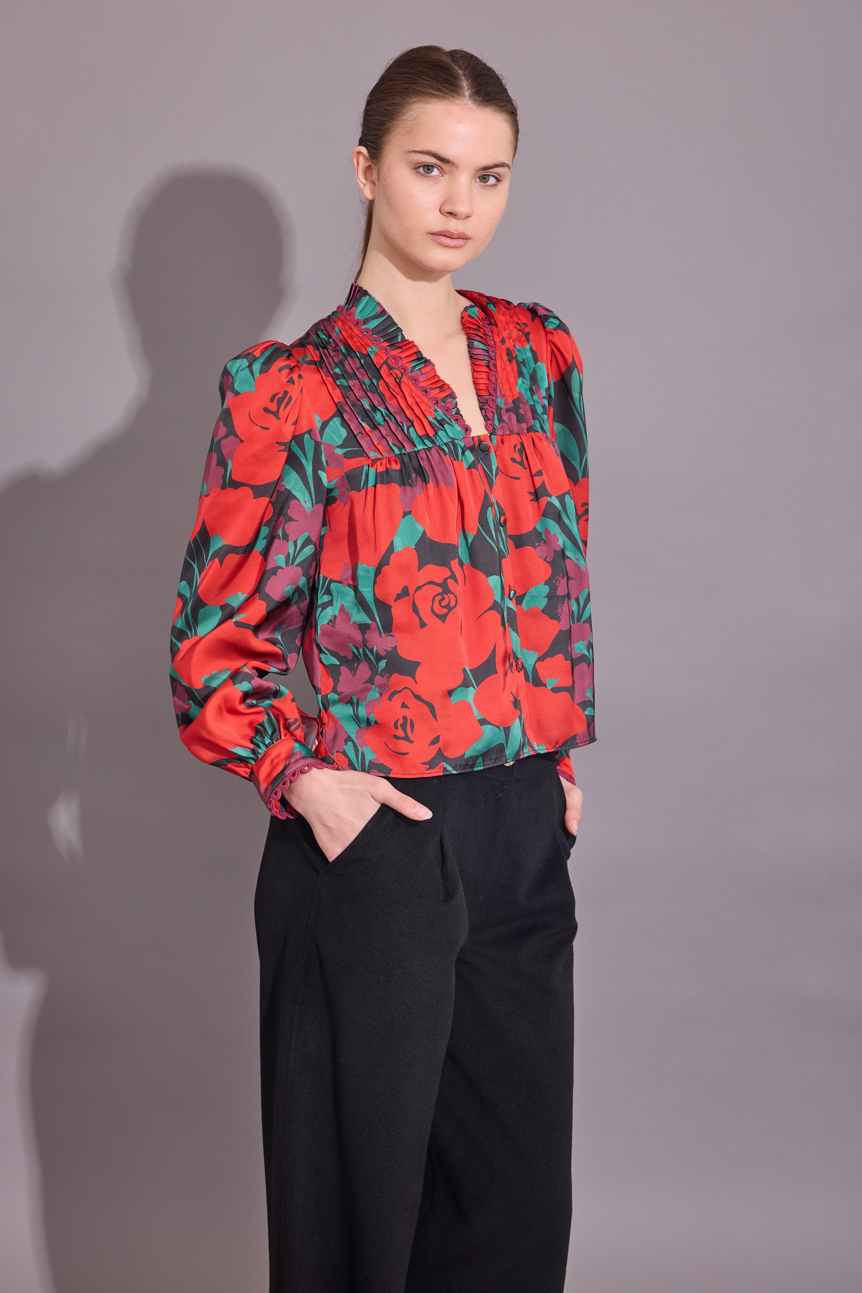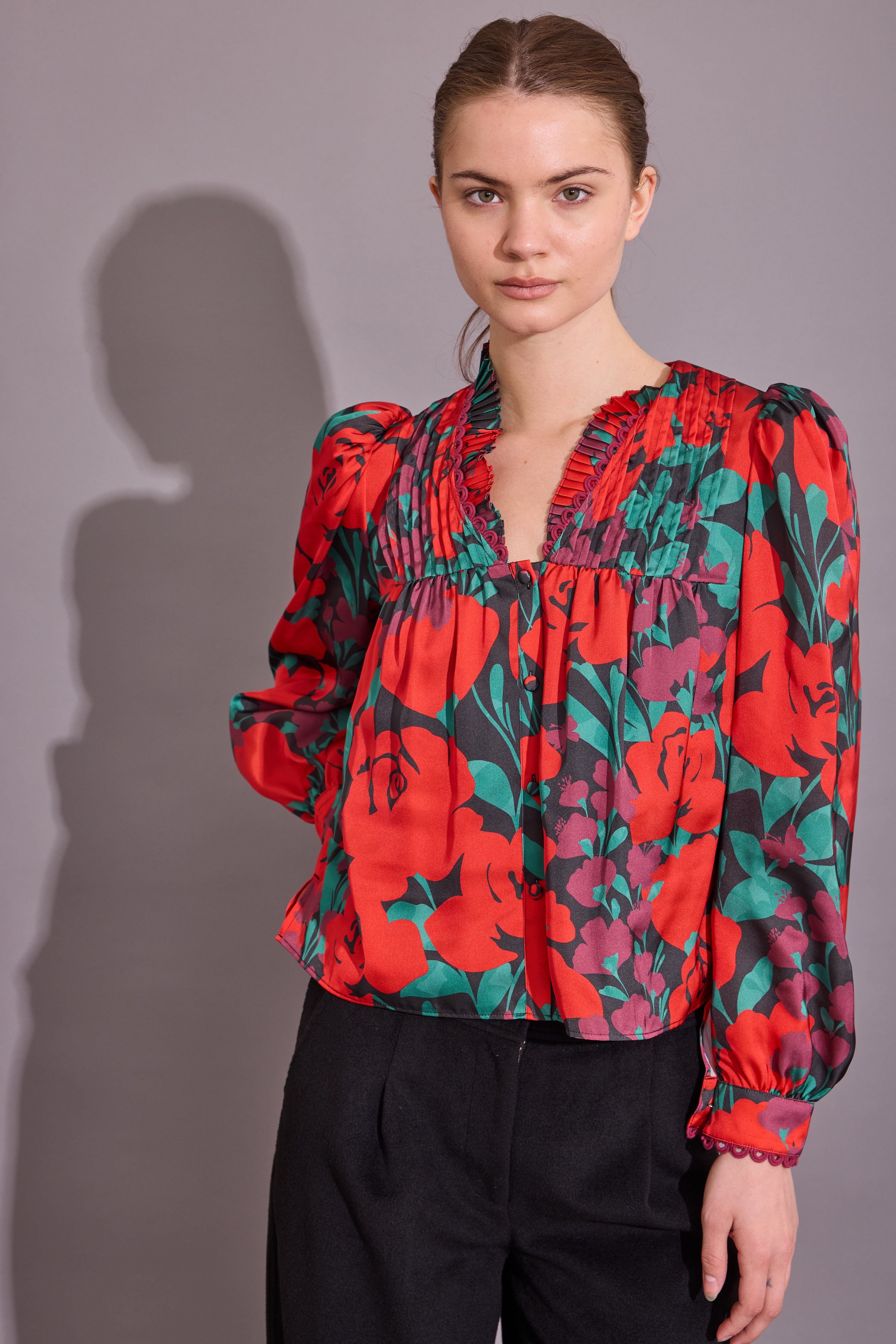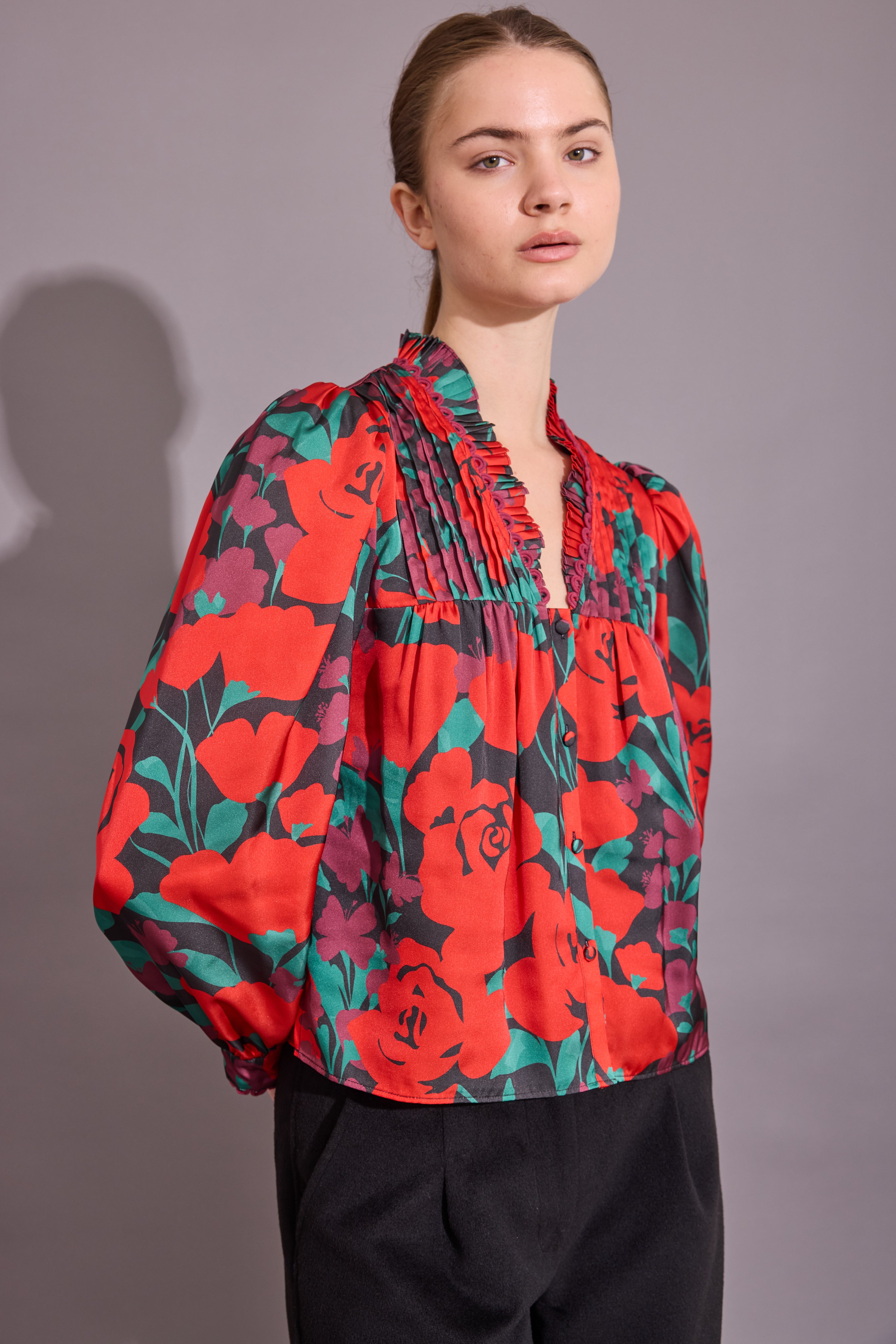 Bold blooms meet effortless sophistication in the Oliver Top. Designed with a flattering gathered neckline and feminine pleat details, this blouse brings a touch of romance to your everyday style. The rich floral print and billowy sleeves make it perfect for dressing up denim or pairing with tailored pants for a polished look. Finished with subtle trim at the cuffs, it’s an instant favorite for workdays, dinners, and everything in between.