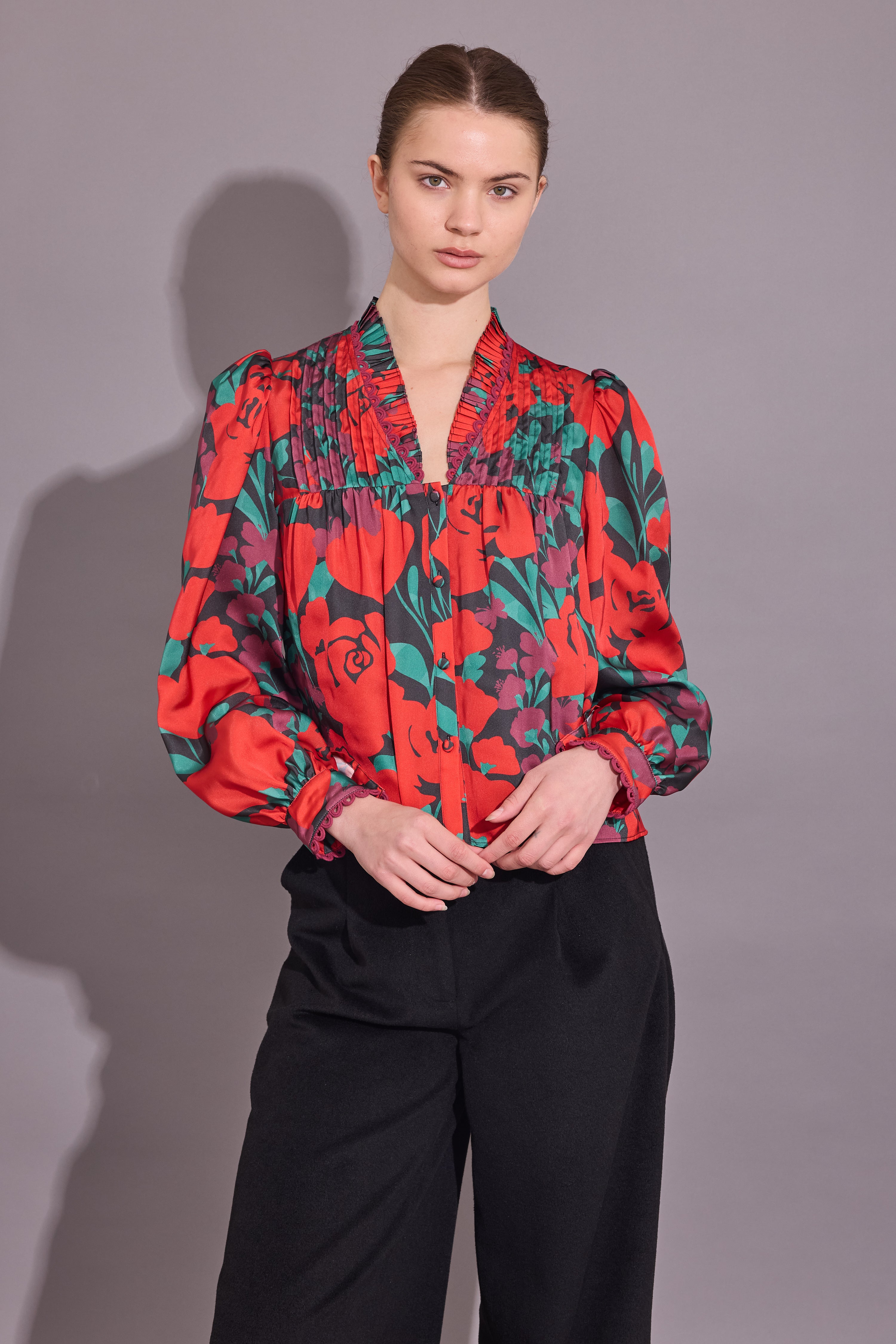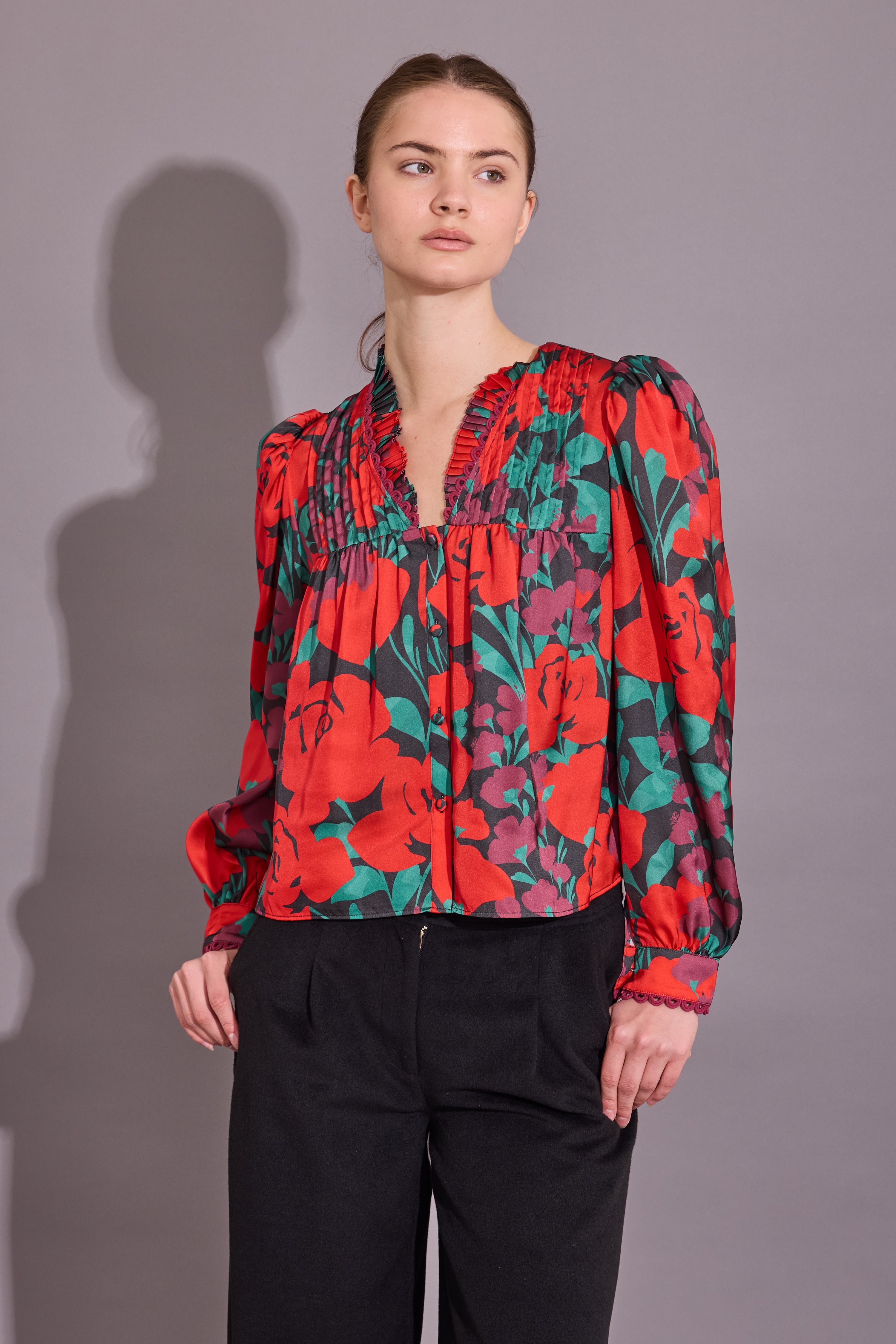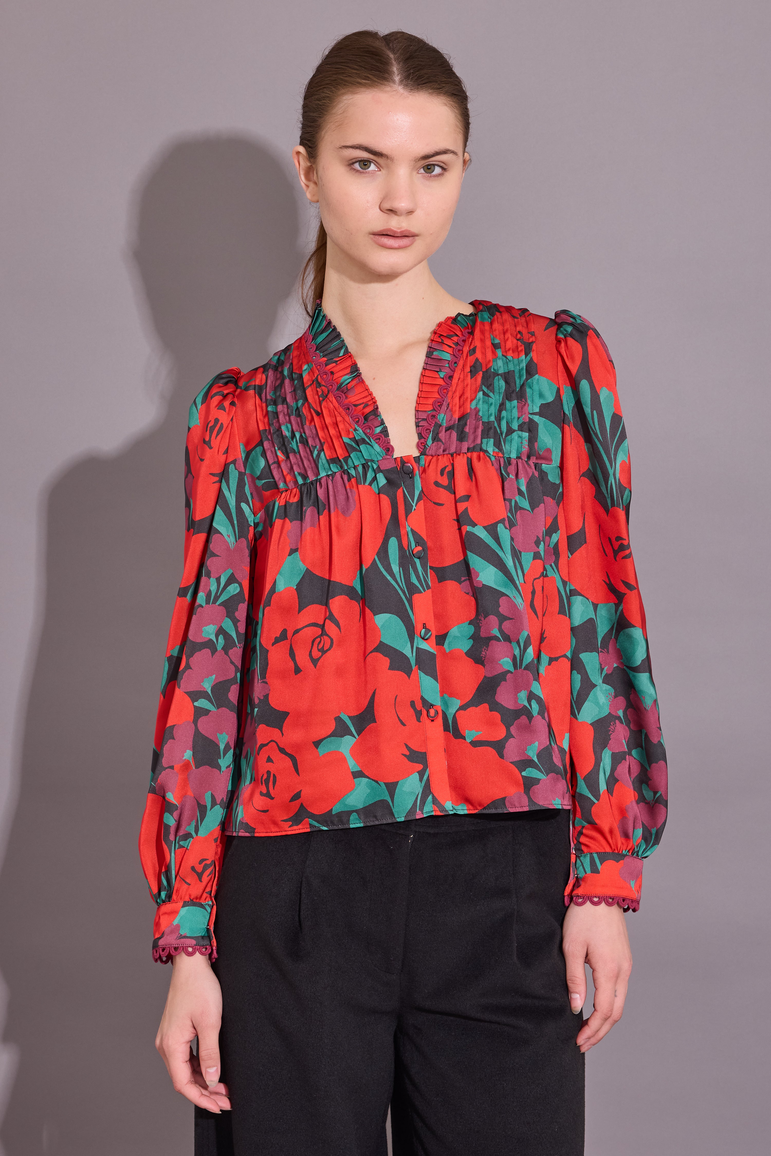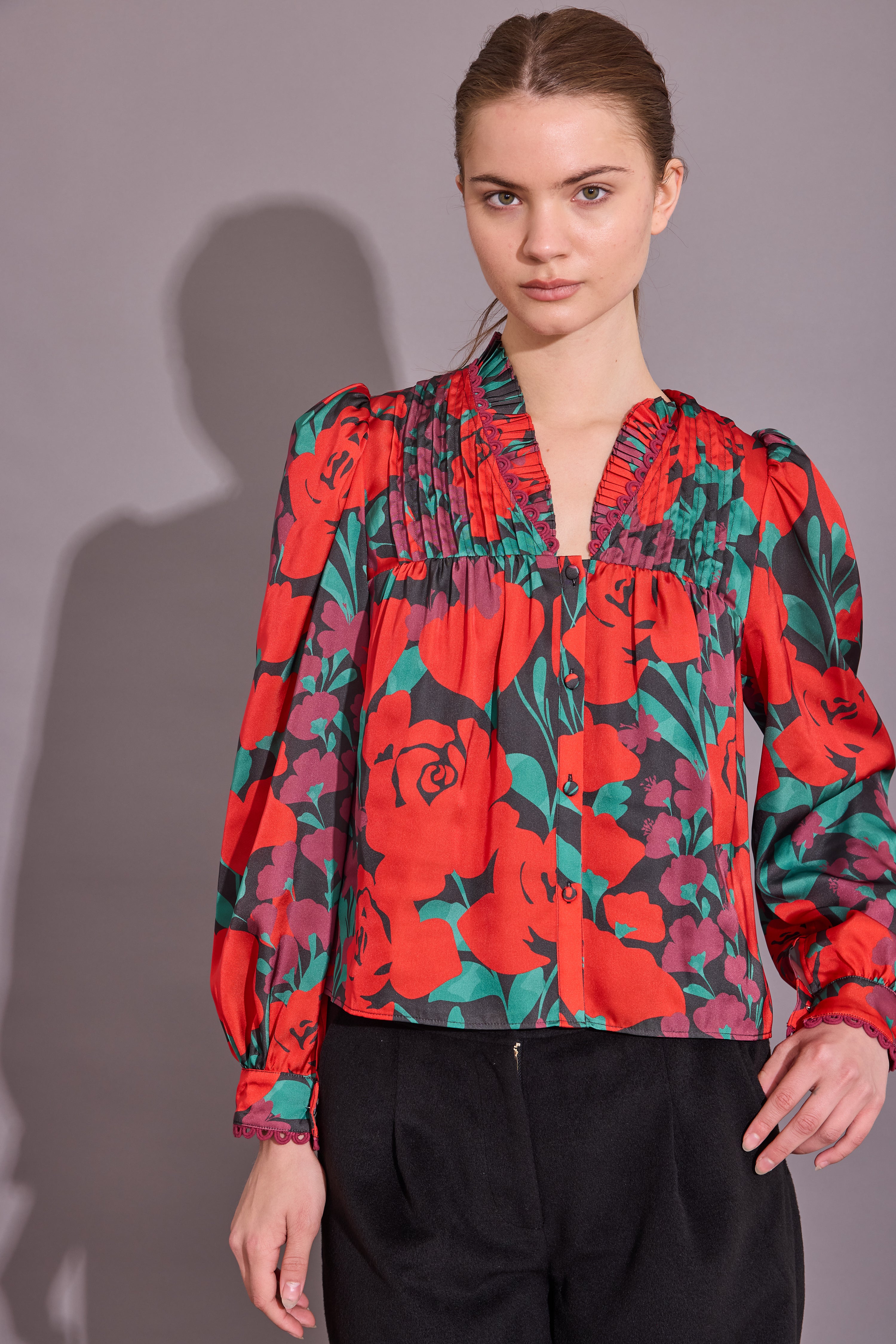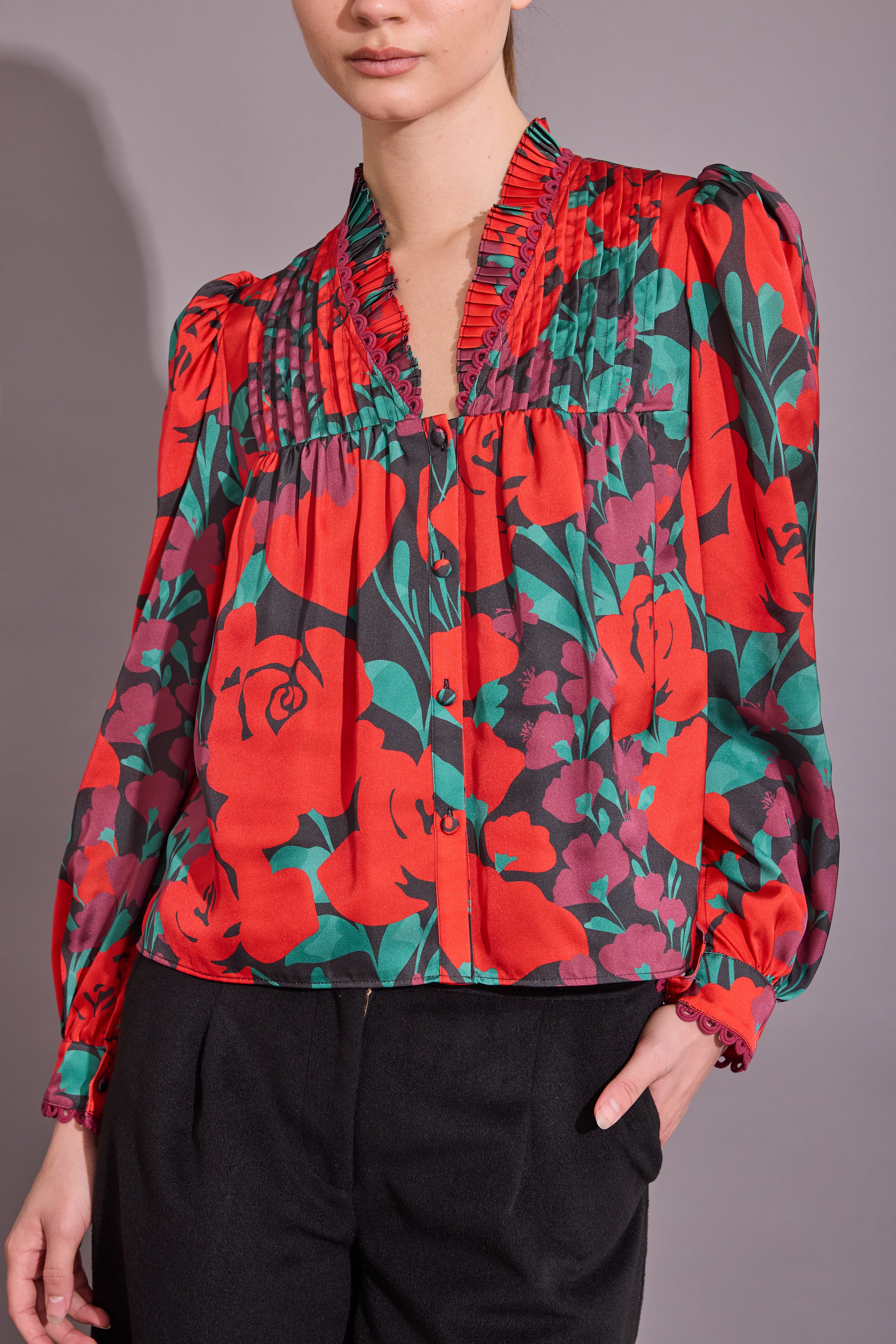 Bold blooms meet effortless sophistication in the Oliver Top. Designed with a flattering gathered neckline and feminine pleat details, this blouse brings a touch of romance to your everyday style. The rich floral print and billowy sleeves make it perfect for dressing up denim or pairing with tailored pants for a polished look. Finished with subtle trim at the cuffs, it’s an instant favorite for workdays, dinners, and everything in between.