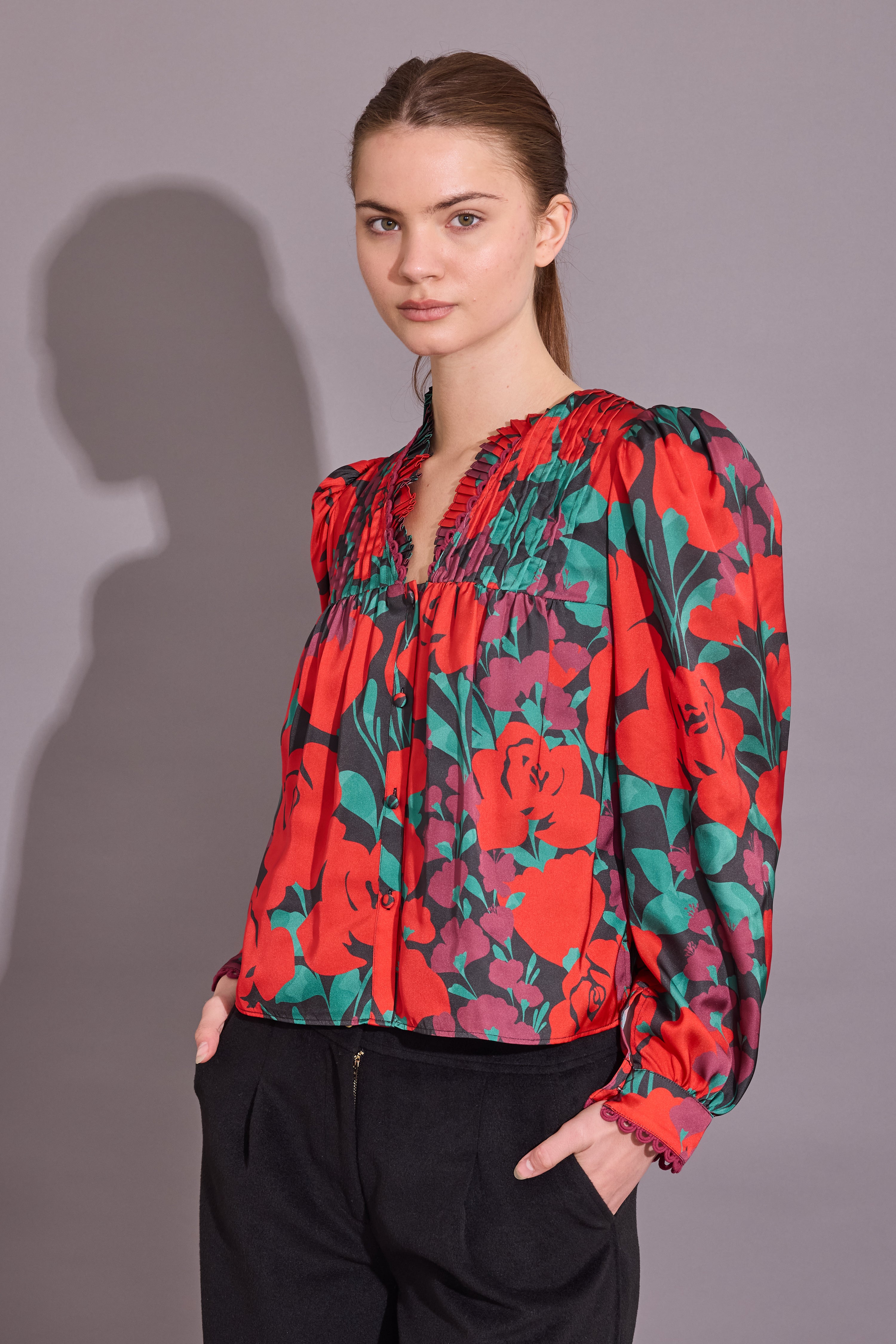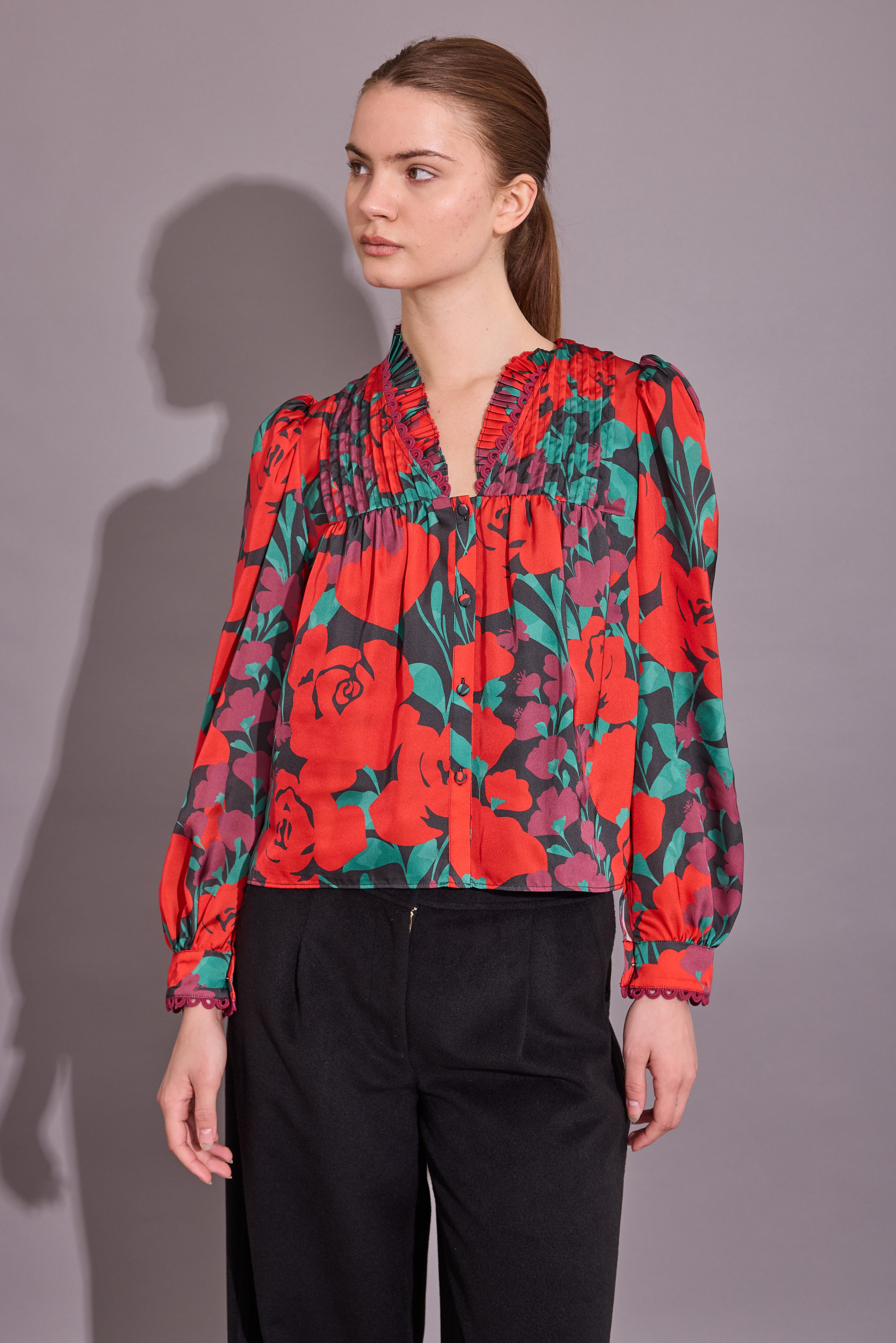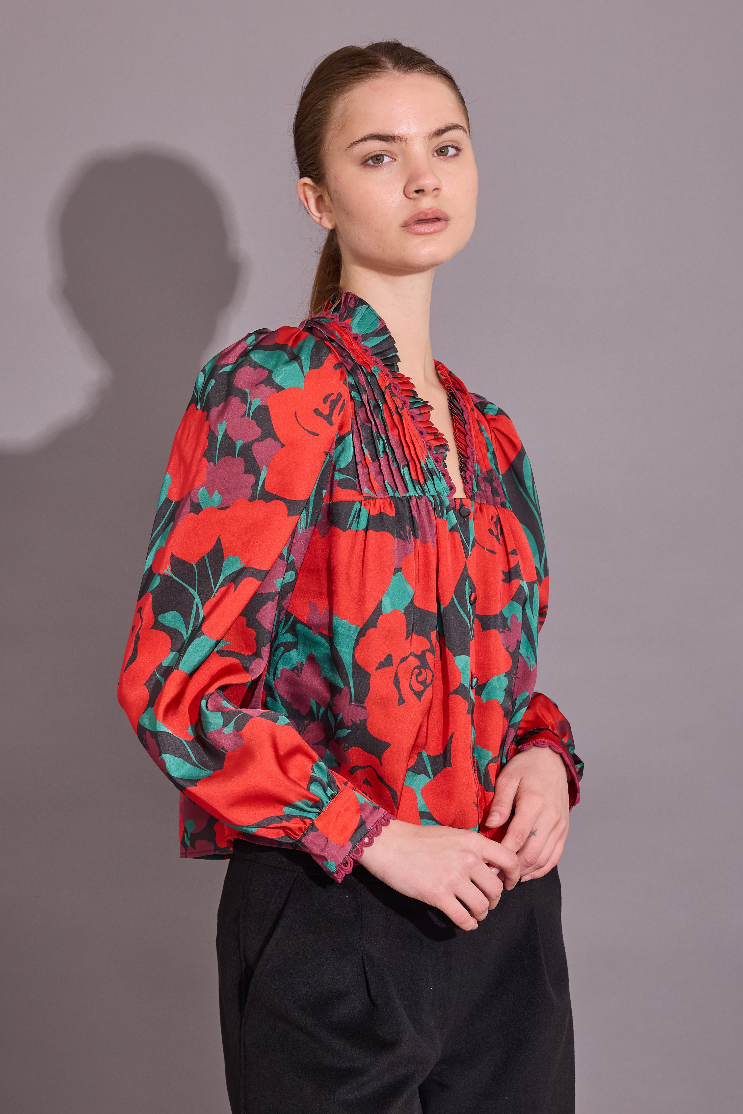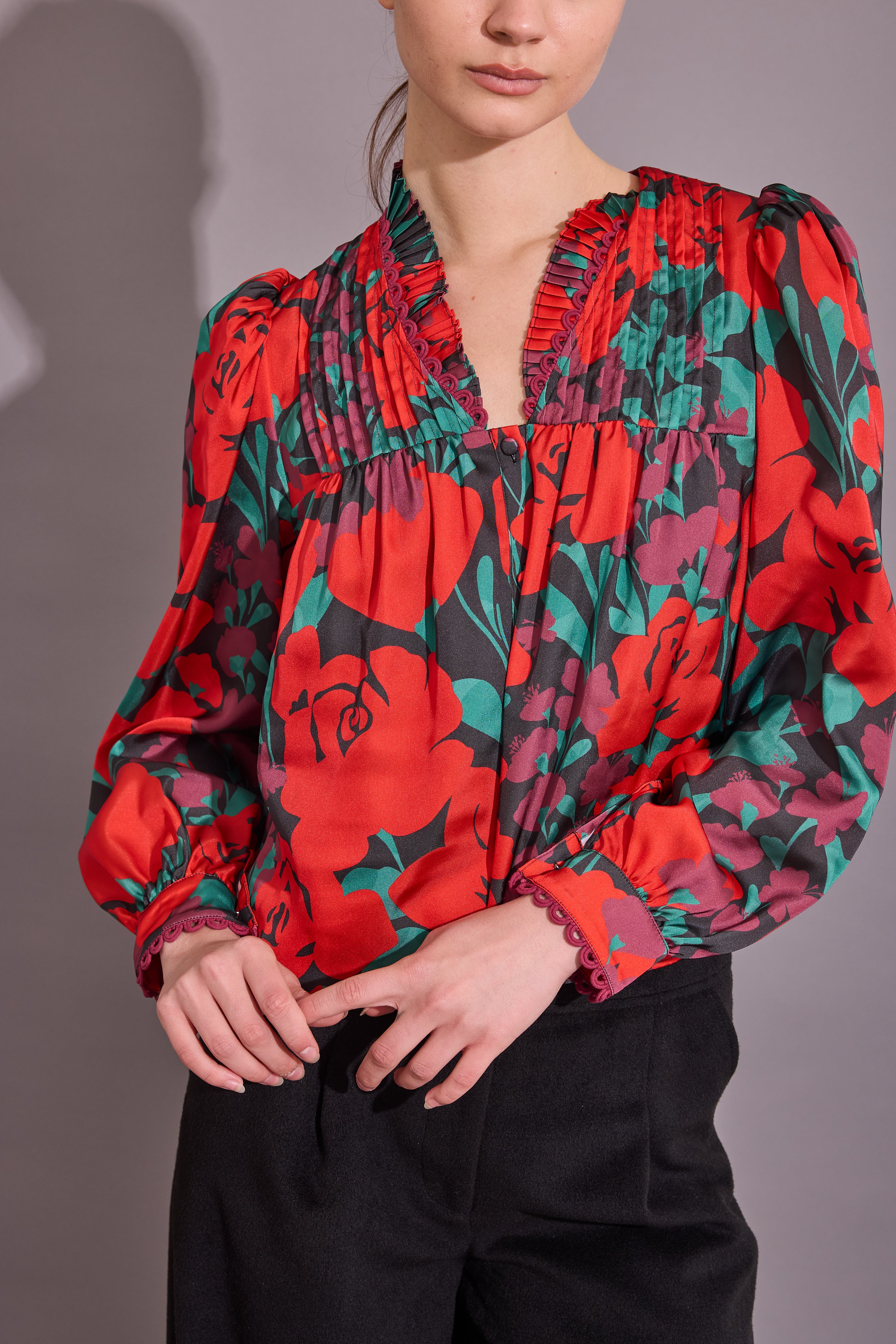 Bold blooms meet effortless sophistication in the Oliver Top. Designed with a flattering gathered neckline and feminine pleat details, this blouse brings a touch of romance to your everyday style. The rich floral print and billowy sleeves make it perfect for dressing up denim or pairing with tailored pants for a polished look. Finished with subtle trim at the cuffs, it’s an instant favorite for workdays, dinners, and everything in between.
