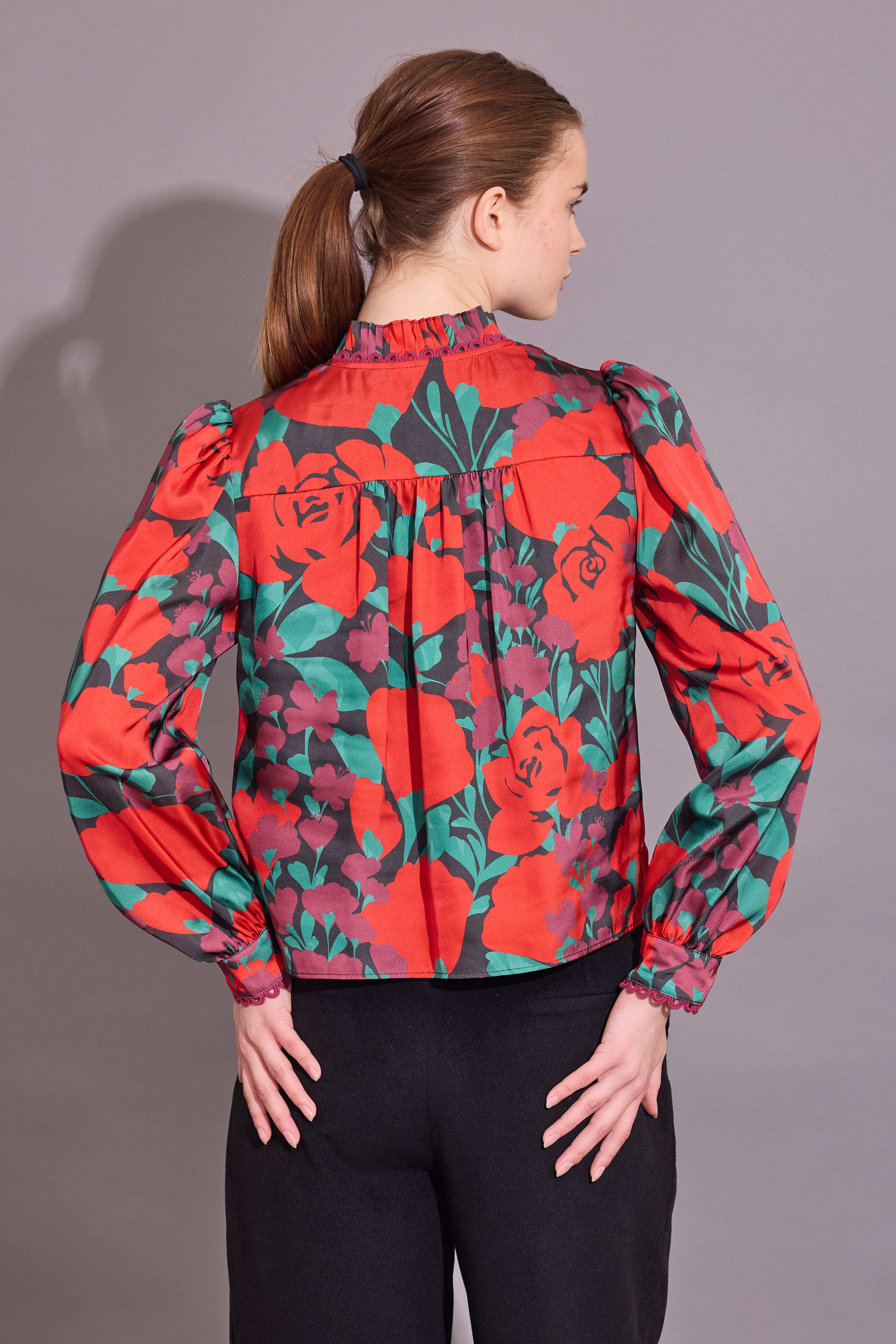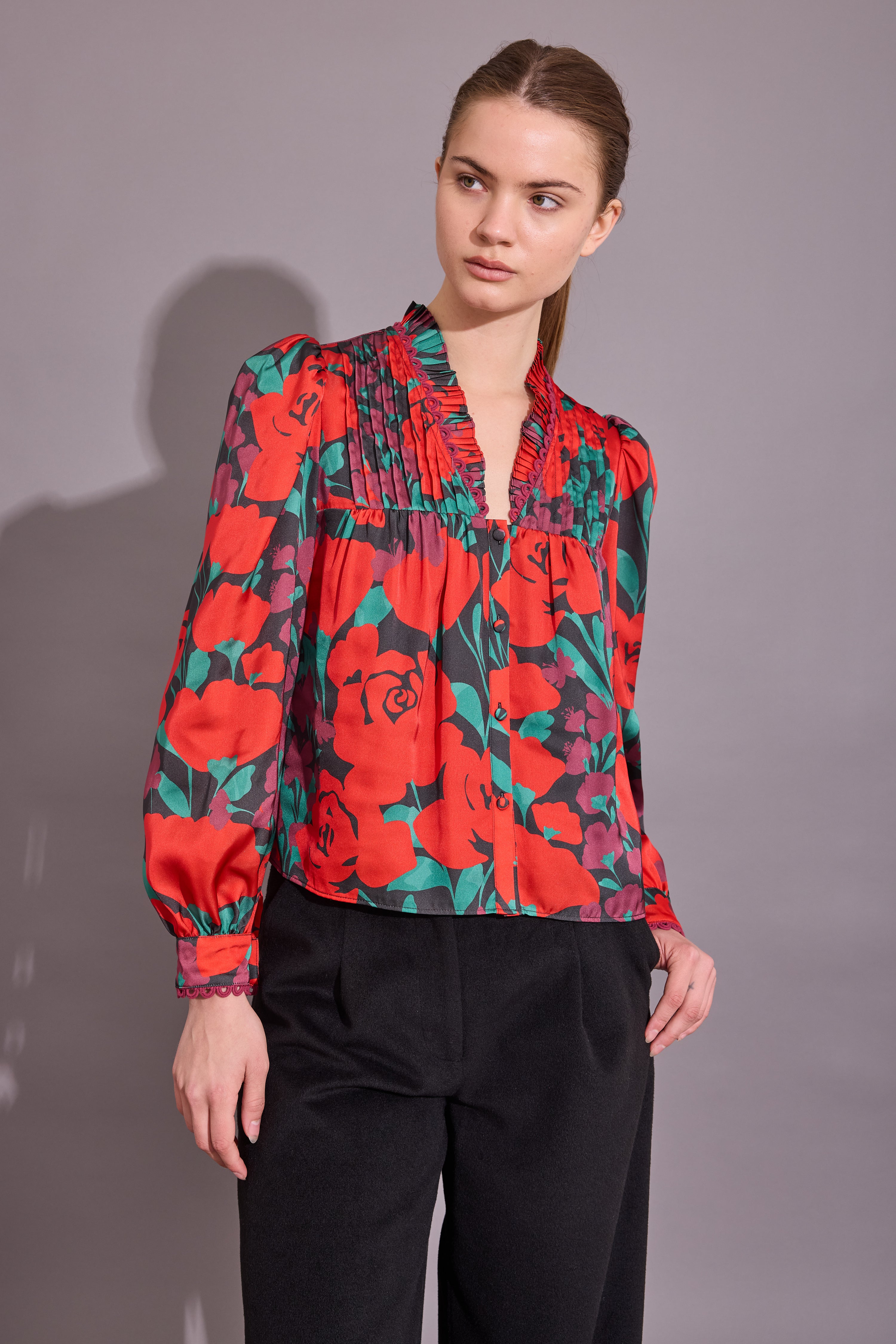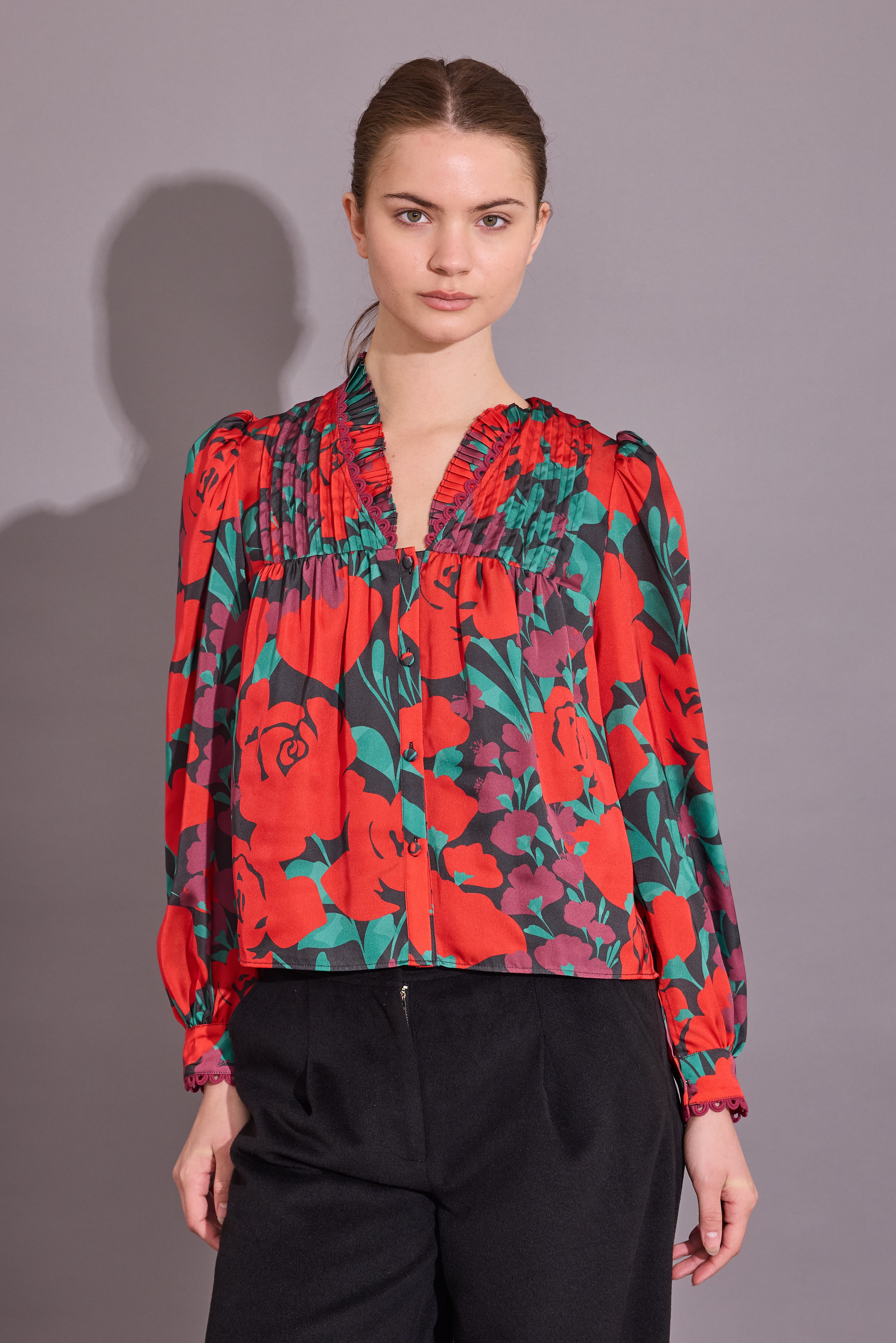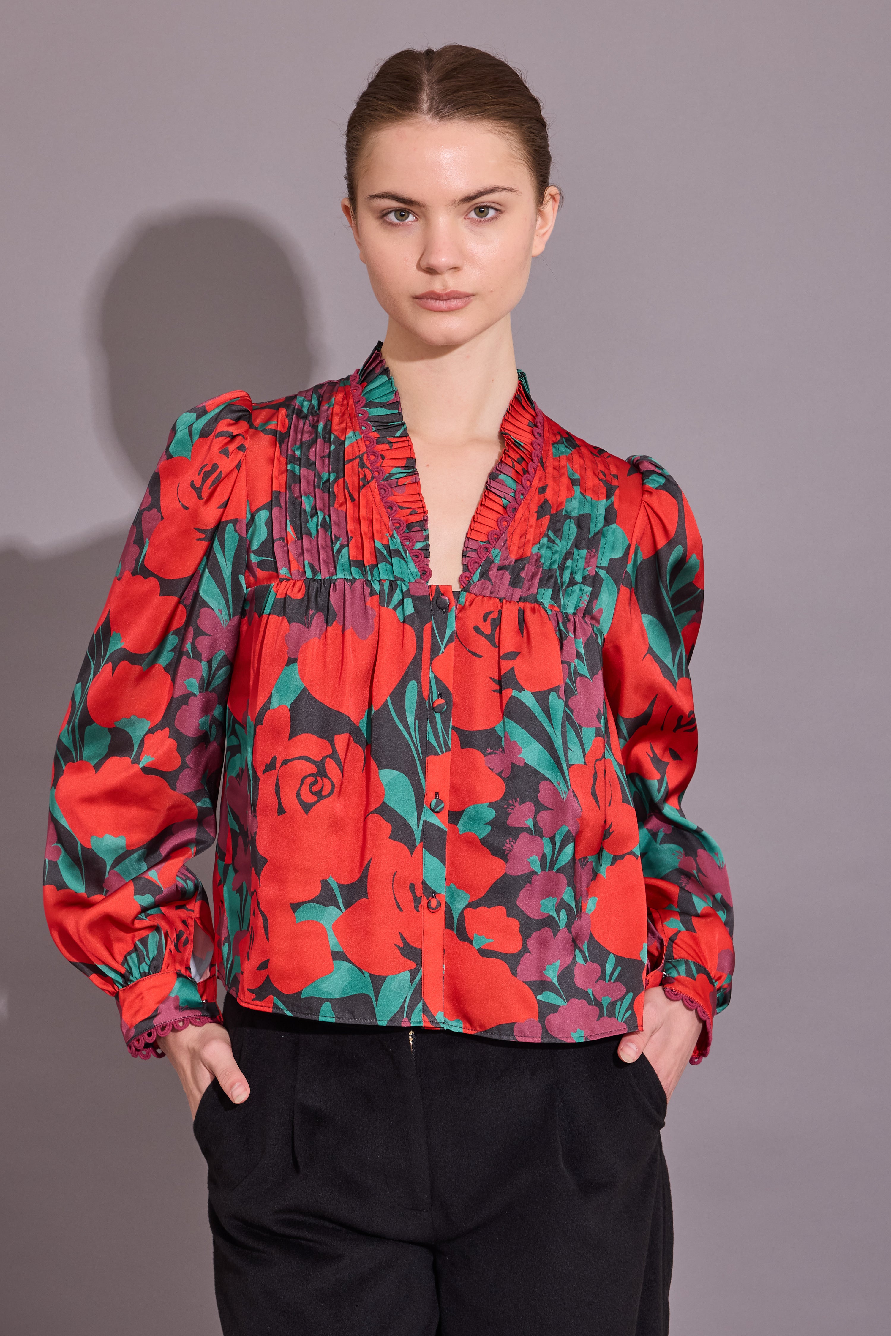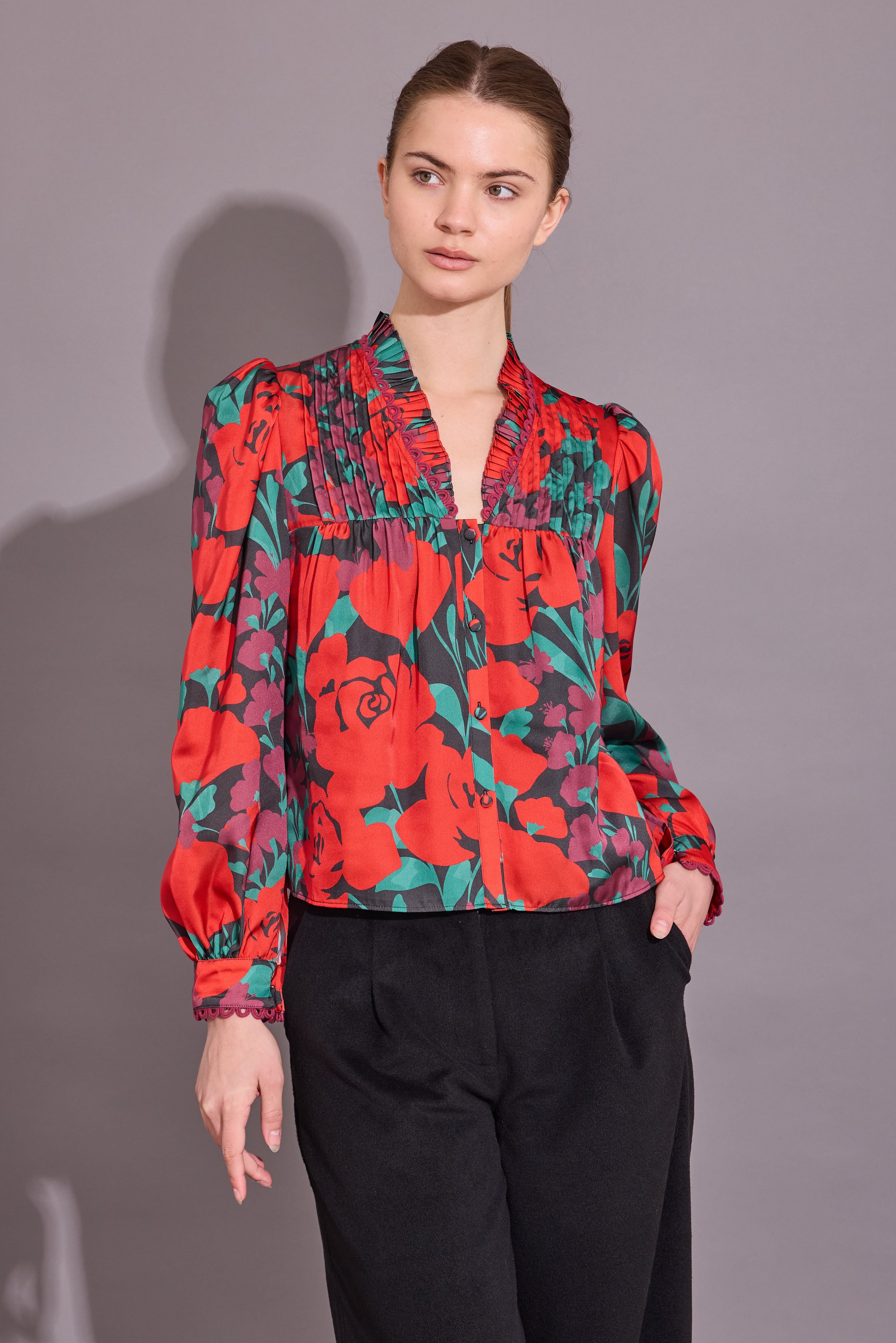 Bold blooms meet effortless sophistication in the Oliver Top. Designed with a flattering gathered neckline and feminine pleat details, this blouse brings a touch of romance to your everyday style. The rich floral print and billowy sleeves make it perfect for dressing up denim or pairing with tailored pants for a polished look. Finished with subtle trim at the cuffs, it’s an instant favorite for workdays, dinners, and everything in between.