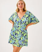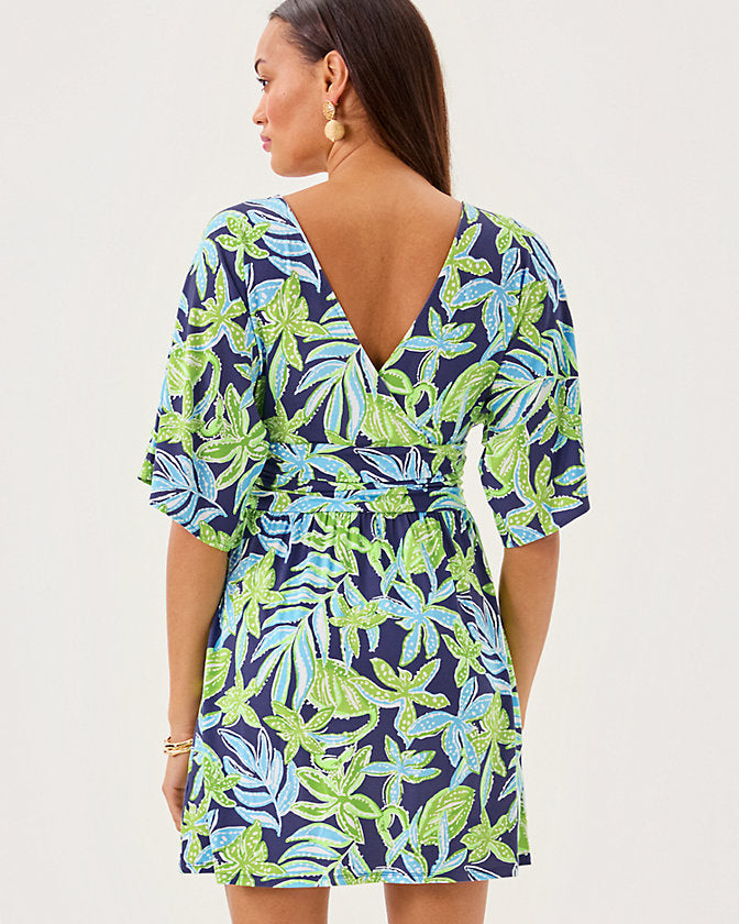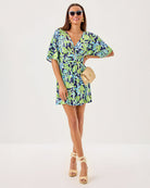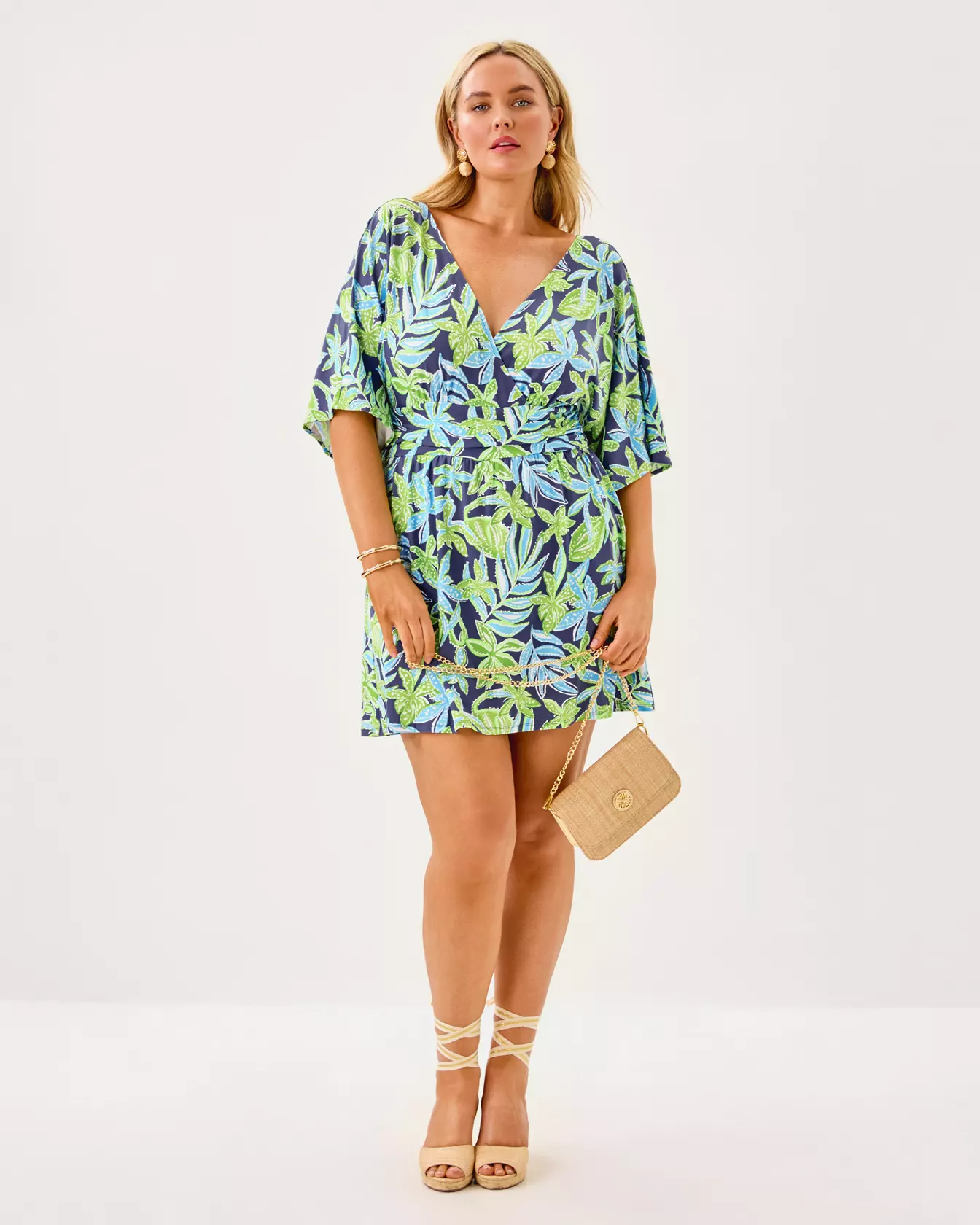 - Skirted romper with a surplice neckline, elbow-length kimono sleeves, and a ruched waistband.