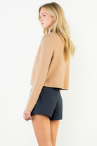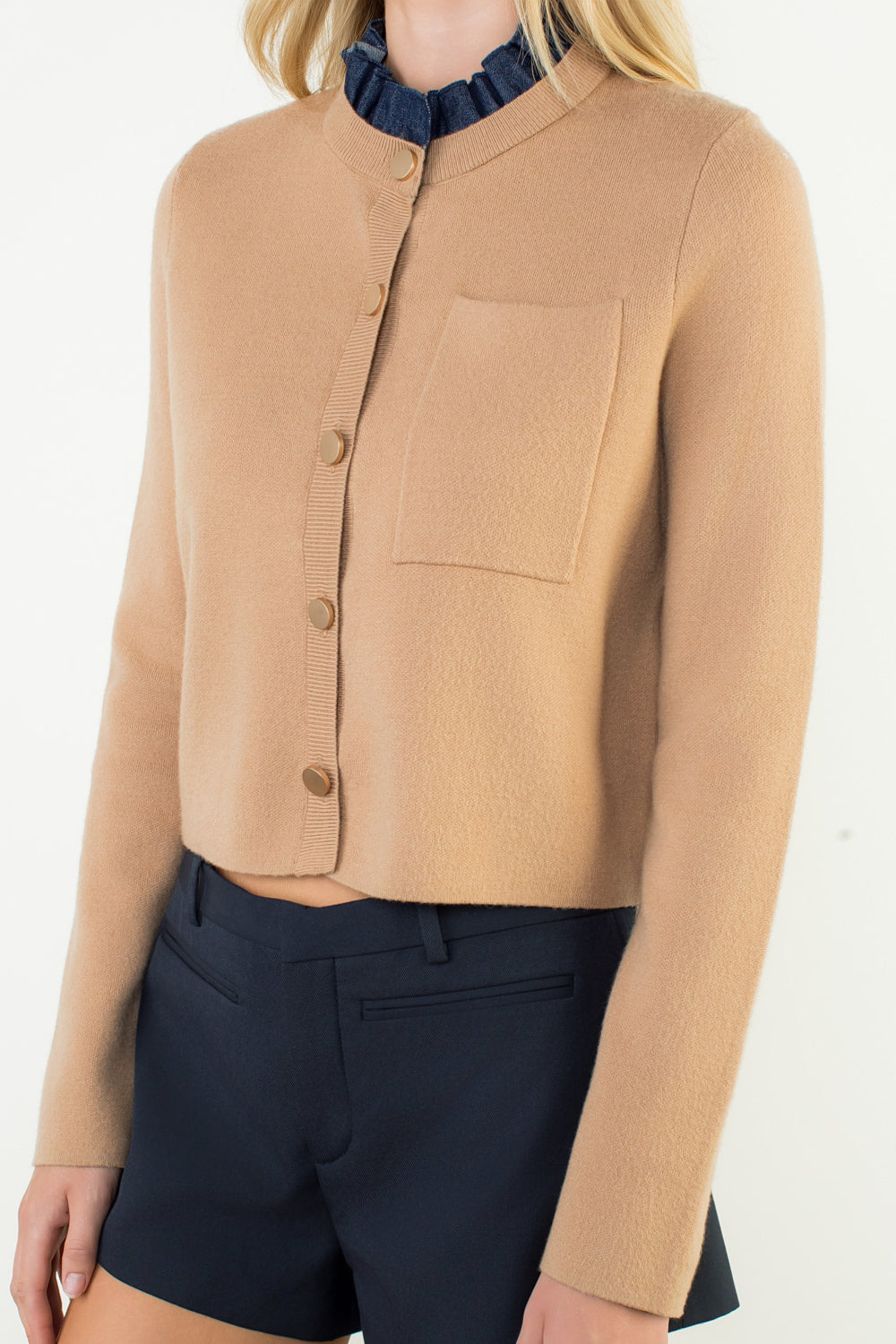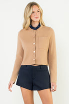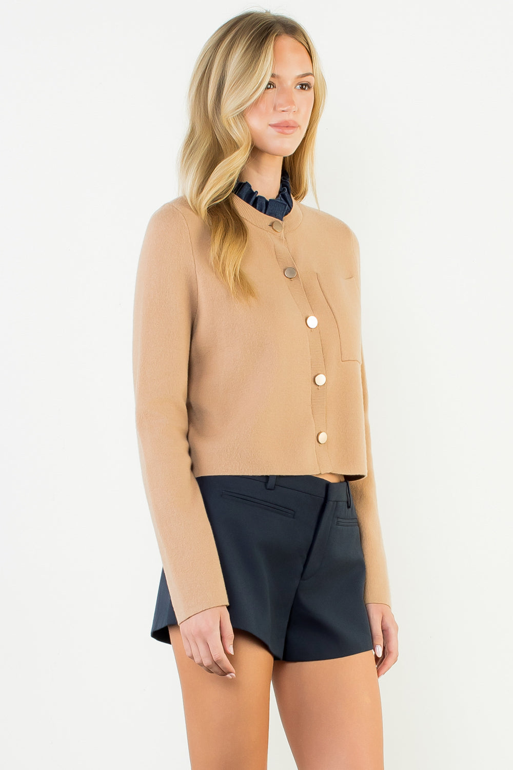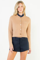 Effortlessly refined and endlessly versatile, the Sasha Cardigan is a timeless addition to your wardrobe. Crafted in a luxe camel knit, this cropped silhouette features a classic crew neckline, front patch pocket, and chic gold button detailing. Perfect for layering over a collared blouse or pairing with tailored shorts or denim for a sophisticated yet relaxed look.