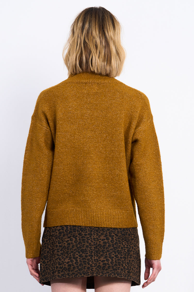 Stay cozy and chic in the Camel Turtleneck Sweater, a wardrobe essential with a modern twist. Knit in a warm camel hue with a subtle shimmer, this relaxed-fit sweater features a classic foldover turtleneck, dropped shoulders, and ribbed trim for a polished finish. Perfect for layering or wearing on its own, it pairs effortlessly with denim, skirts, or tailored trousers for a versatile cold-weather look.