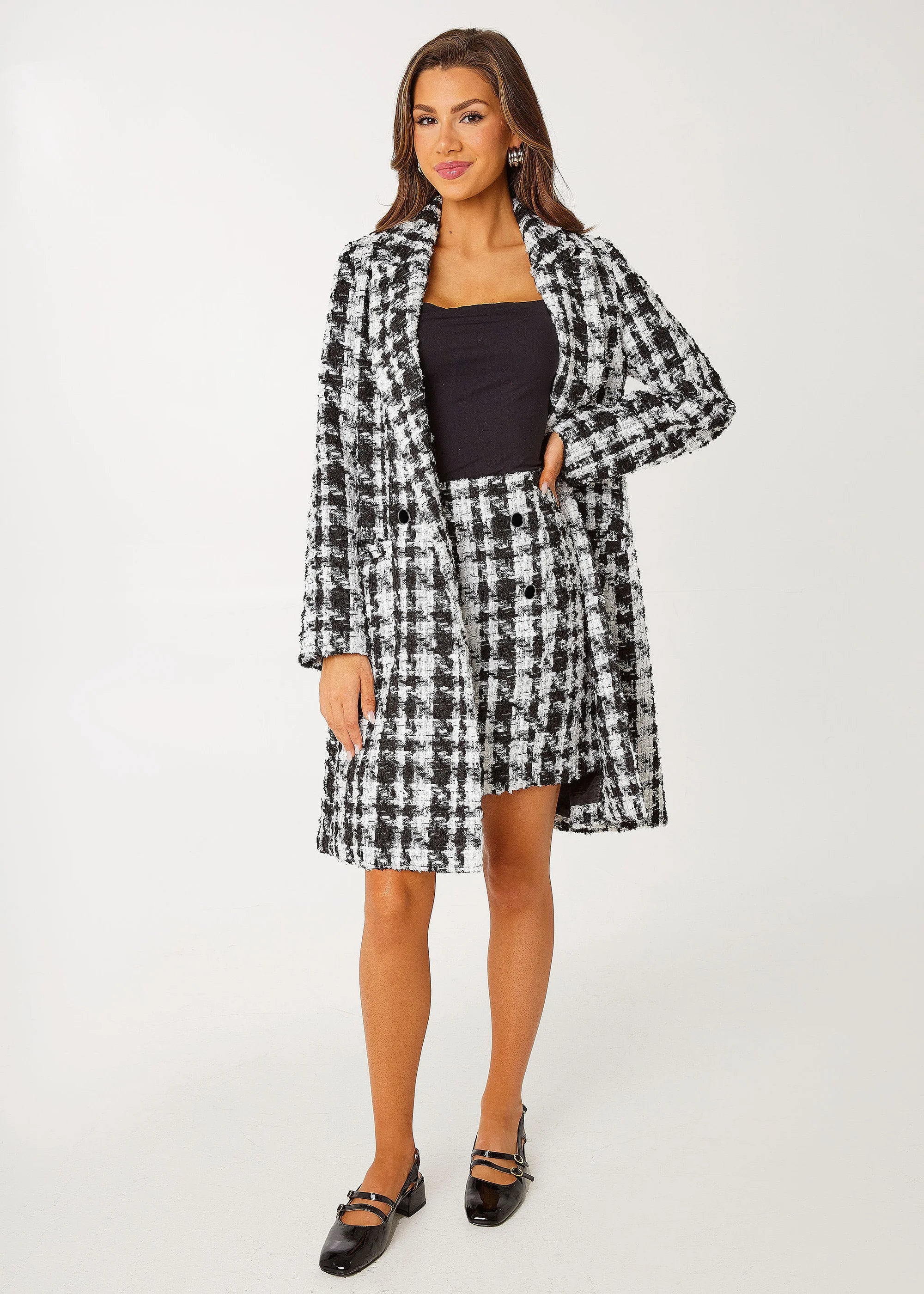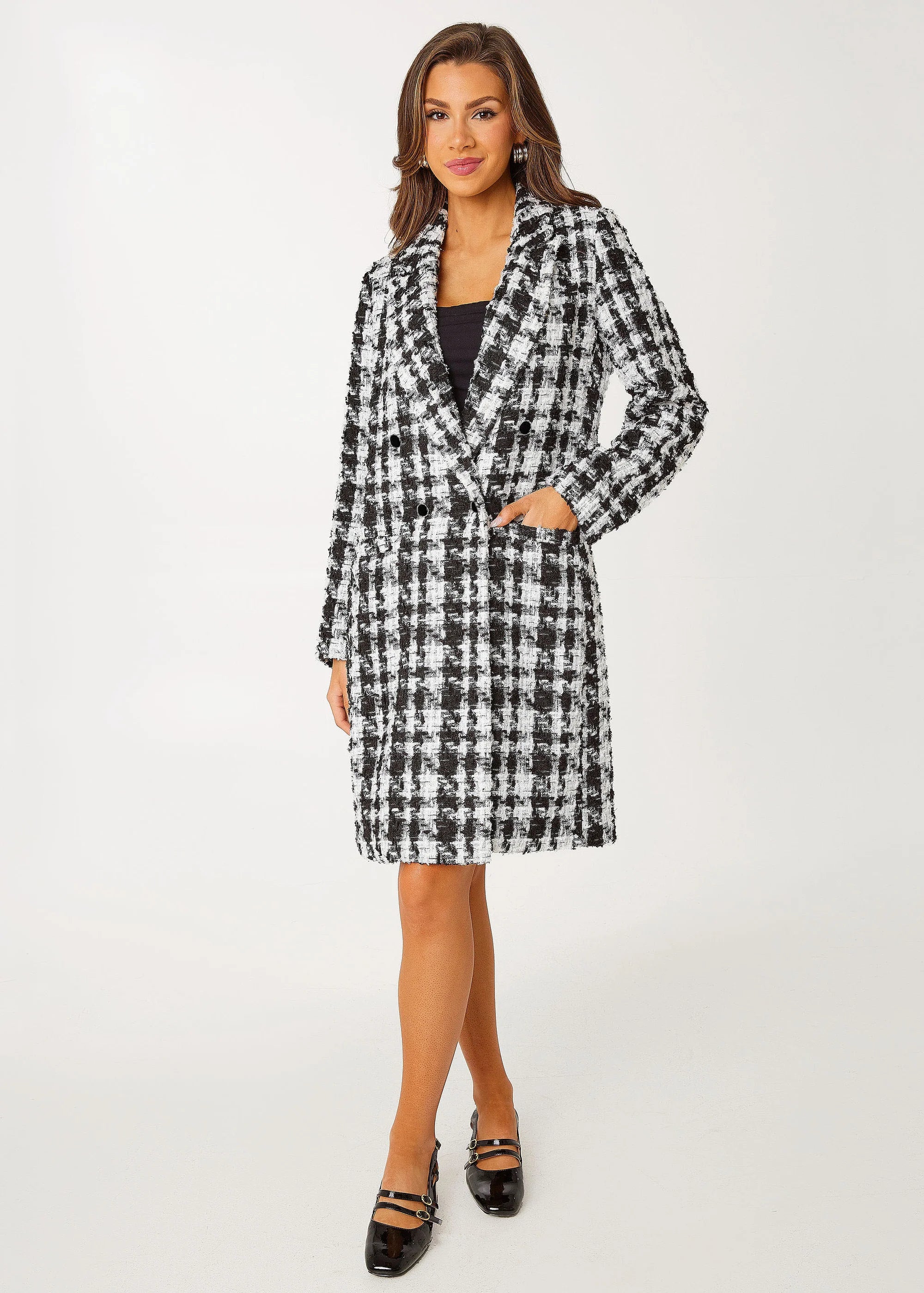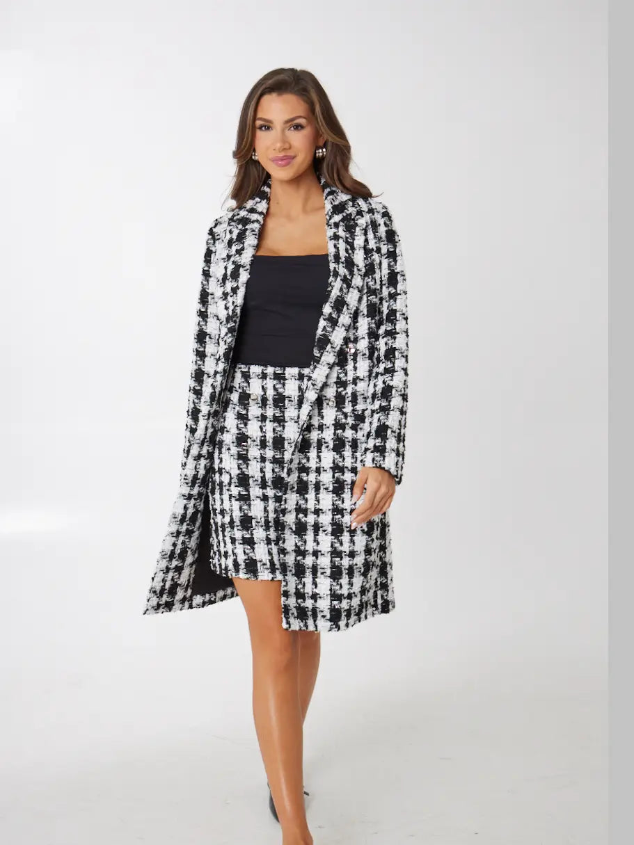 Step into the world of timeless elegance with the Abigail Coat in Black and White Houndstooth Tinsel Tweed from Abbey Glass. This luxury coat is steeped in confidence and playful elegance, offering an effortless confidence for every occasion. Expertly tailored, it showcases a custom fabric in a houndstooth pattern, giving you the opportunity to express your individuality and innate femininity. Join Abbey Glass and explore the art of dressing up, where every day is an occasion.