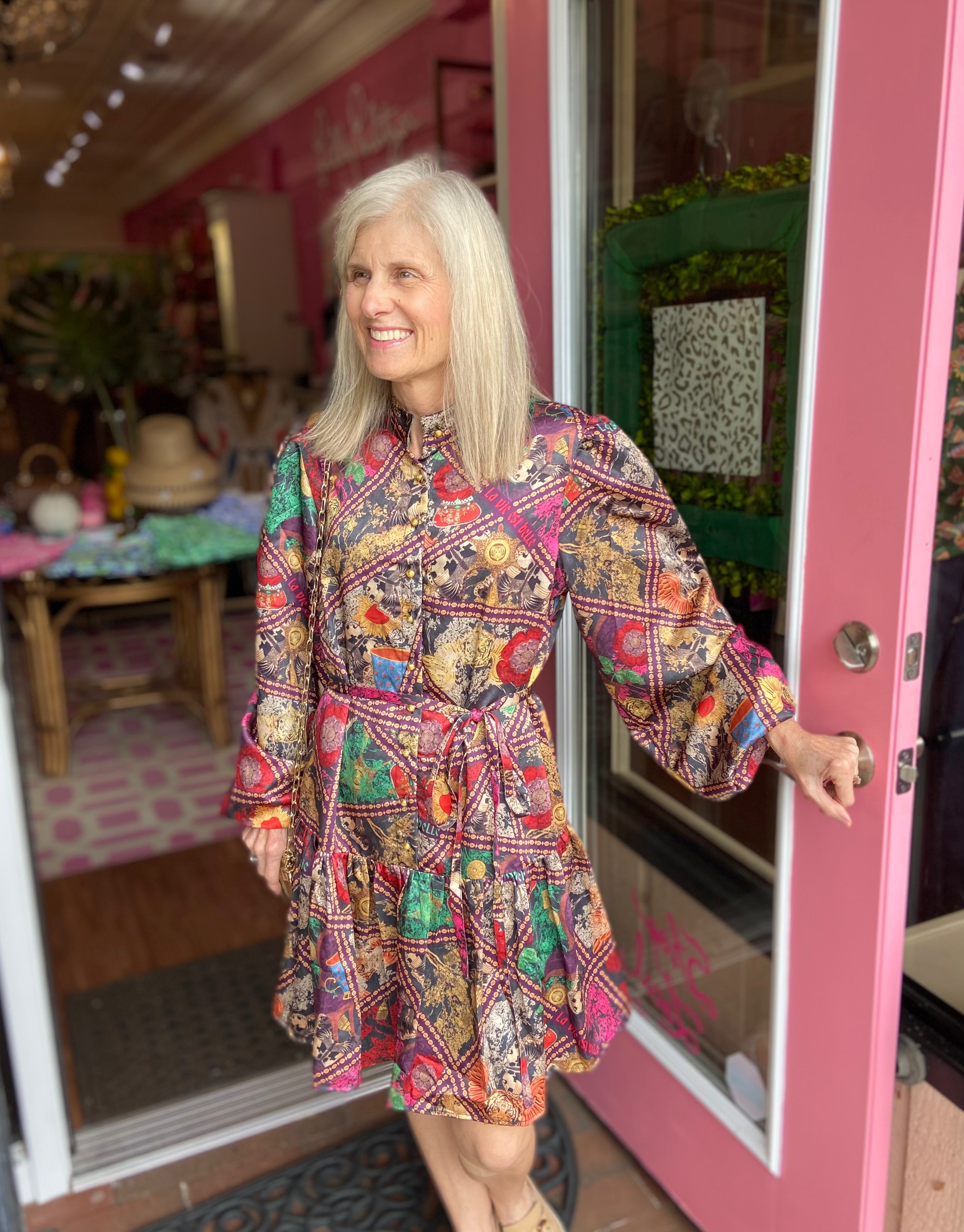 Introducing the Adele dress! This mini long sleeve dress is the perfect addition to your wardrobe. Featuring our royalty print this dress is sure to be a favorite. Pair it with your favorite boots to complete the look!