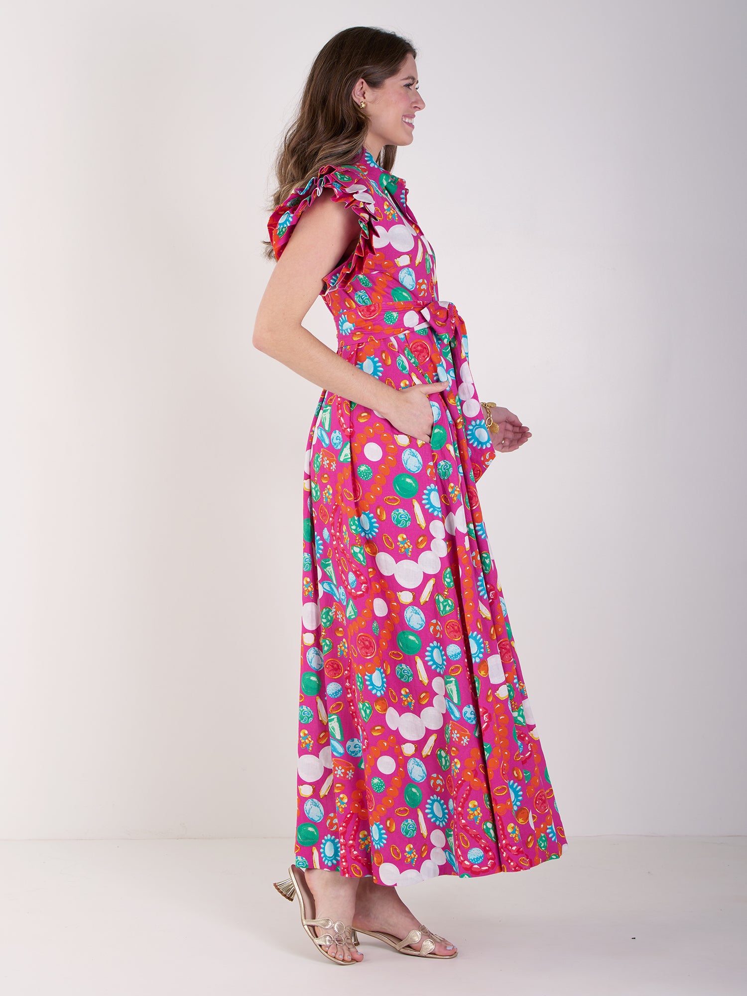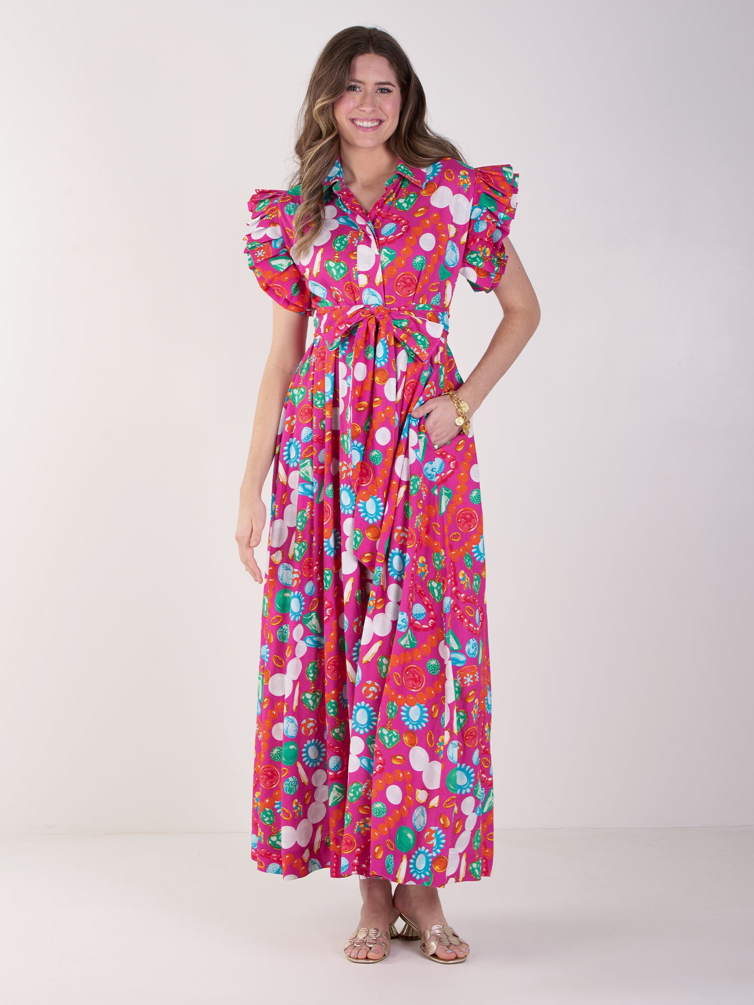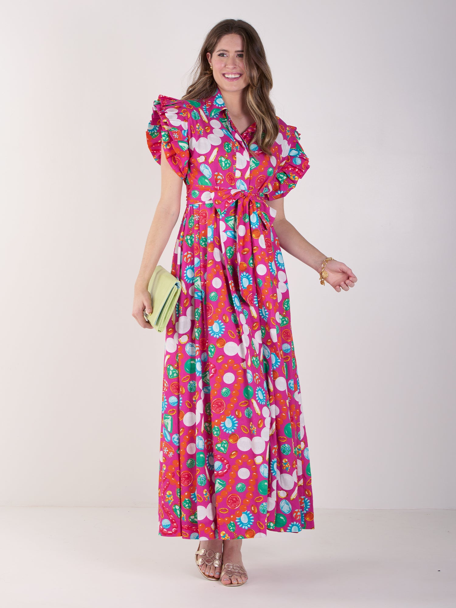 The Anderson Maxi in Jewelry Box is a vibrant showstopper designed to celebrate bold femininity. Featuring a classic fold collar, pleated ruffle sleeves, and signature gold button closure, this dress blends timeless tailoring with expressive detail. A self-tying detachable belt cinches the waist for a flattering silhouette. The Jewelry Box print is a playful homage to Iris Apfel, capturing her iconic love for colorful, oversized jewels and unapologetic accessorizing.