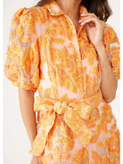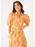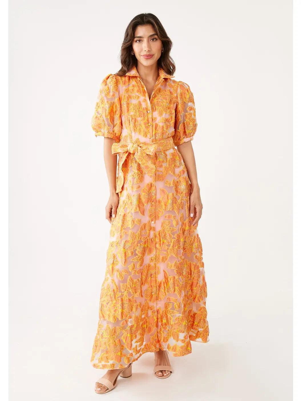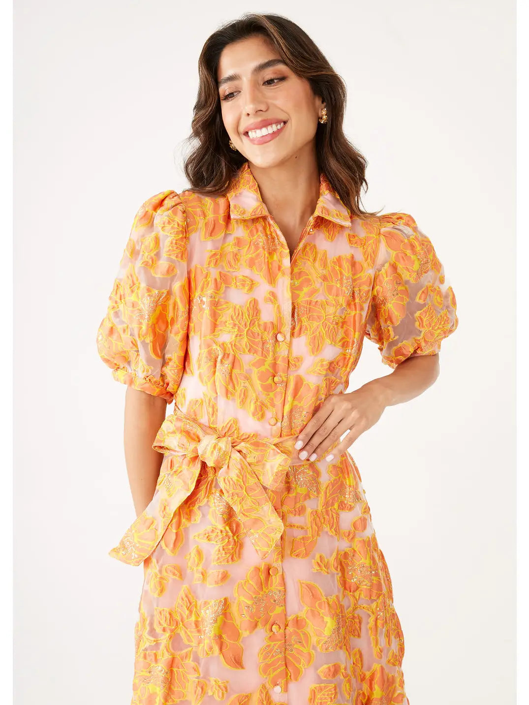 early Fall occasions. With covered buttons, a shirtdress collar and a polished tulip sleeve, this gown will make you feel playful, elegant and modern all at once. For a more formal affair, style this dress with a sparkly earring, your favorite metallic sandal, and a bold lip. Sizing: Tailored fit. If you are between sizes and/or more full across the chest, we recommend sizing up. Make: Short-sleeved collared A-line silhouette. Front closure with covered buttons. Fully lined. Measurements: Length from waist to hem 41" (approximately). Sleeve length: 14" (approximately). Fabric: Organza Care: Dry clean or hand wash recommended The model is 5'8 and wears a size extra small
