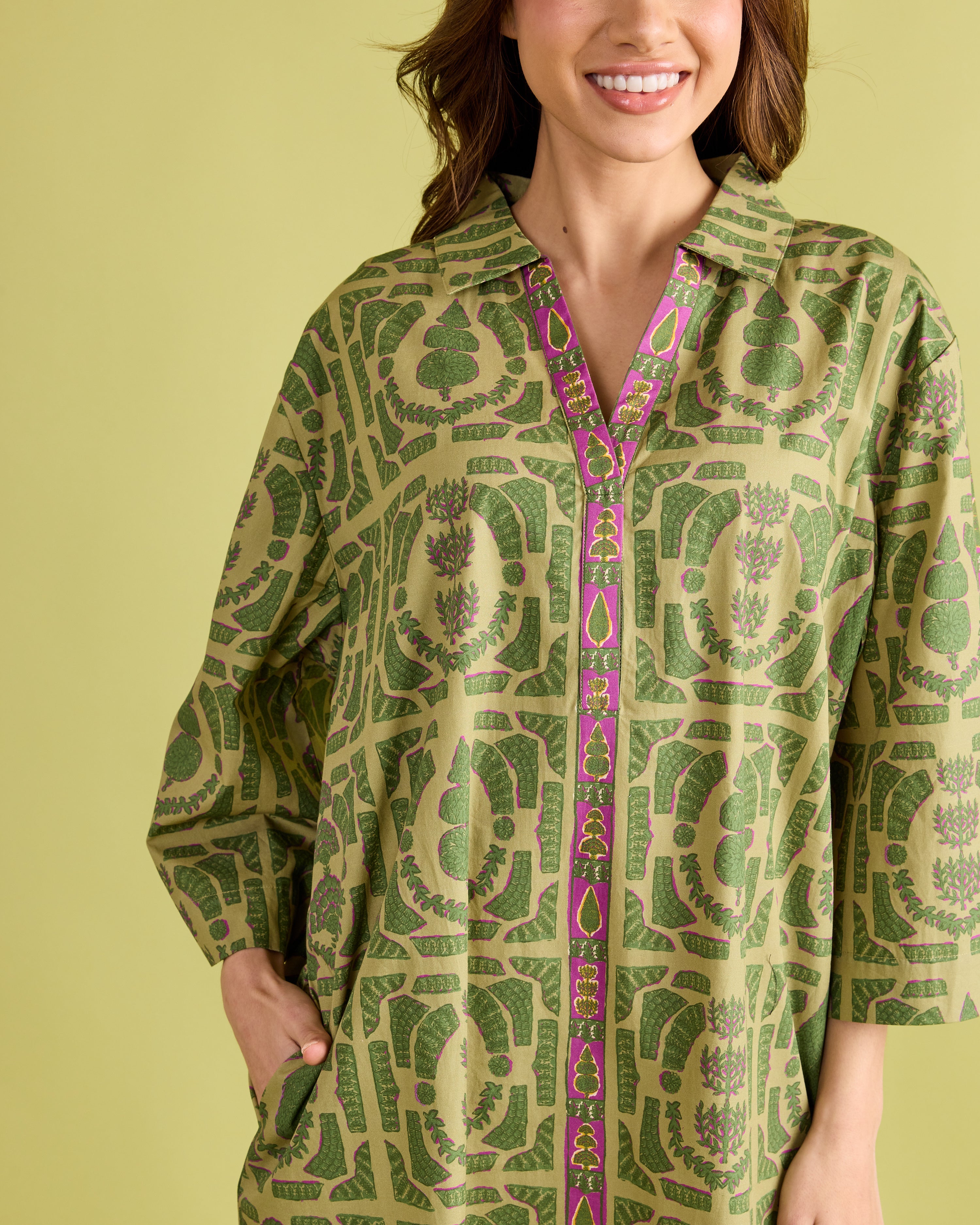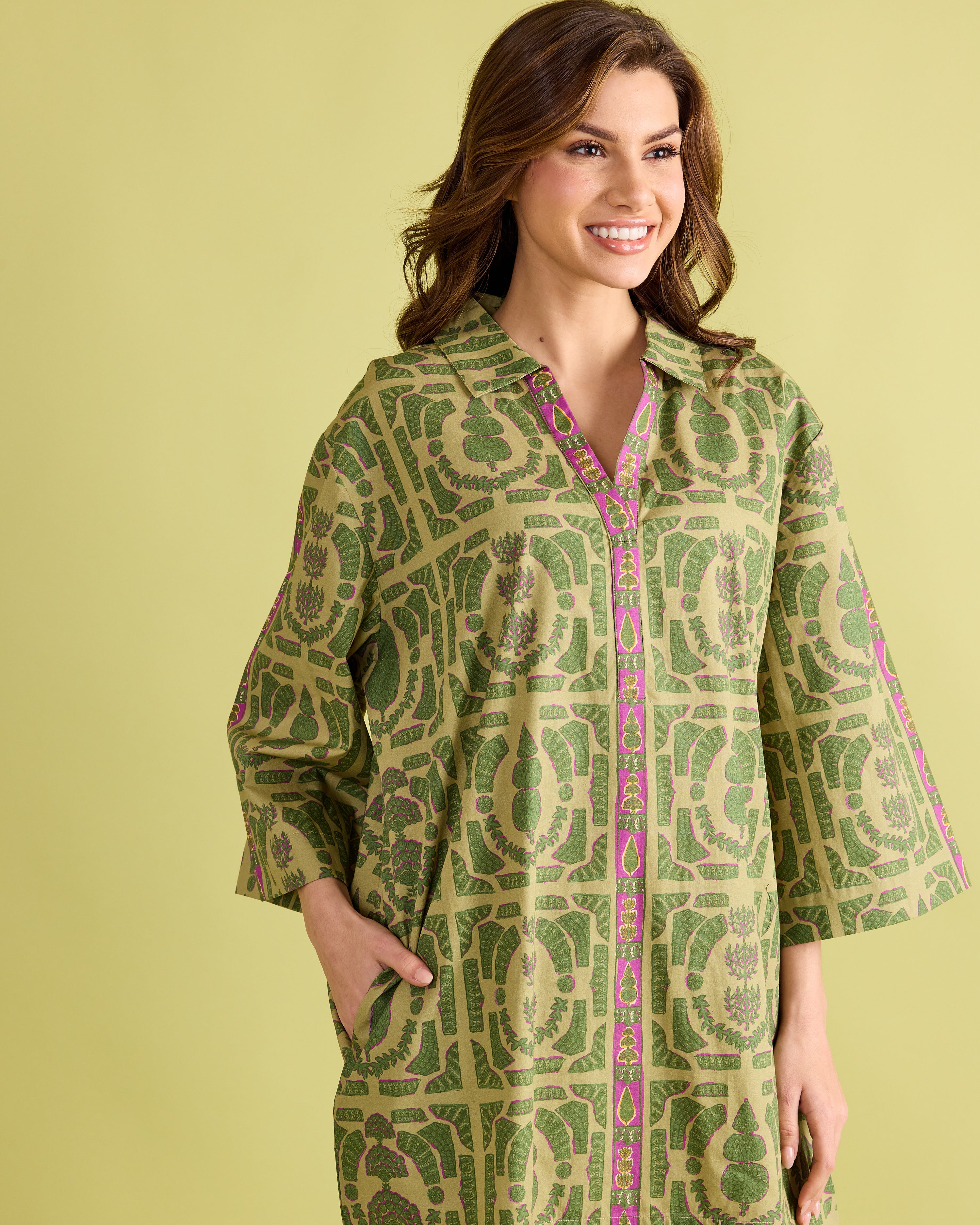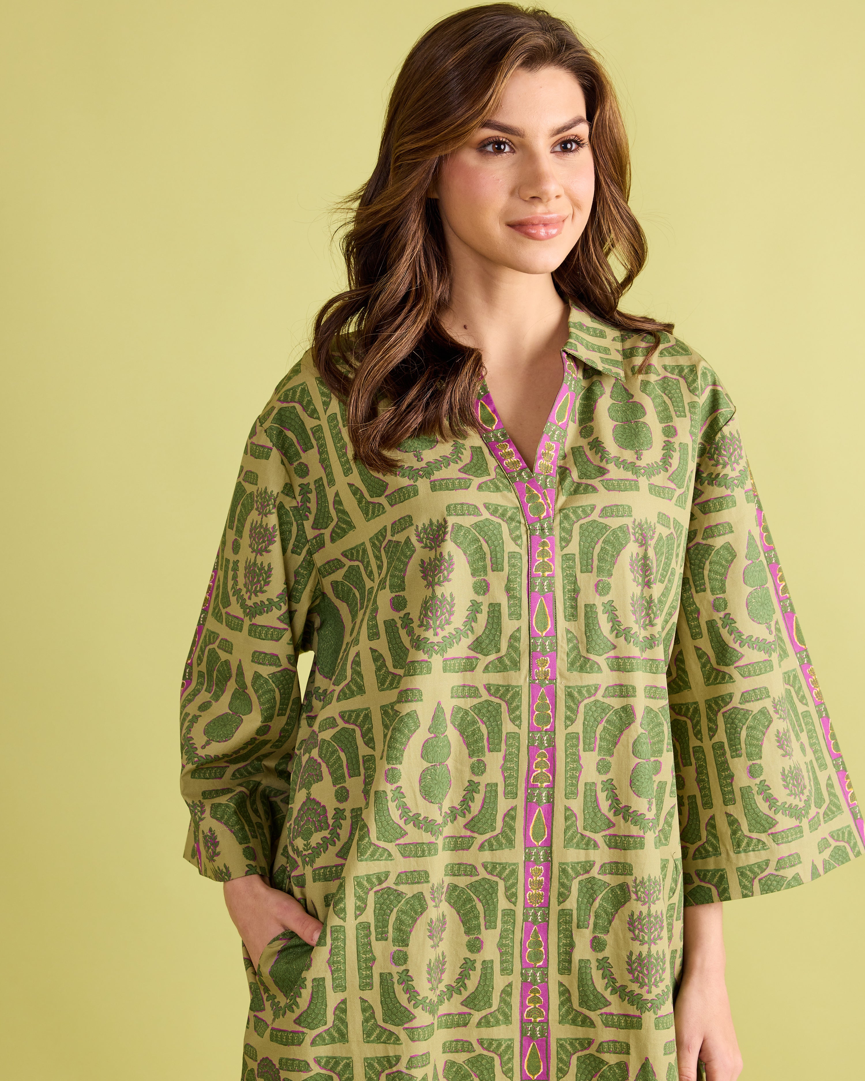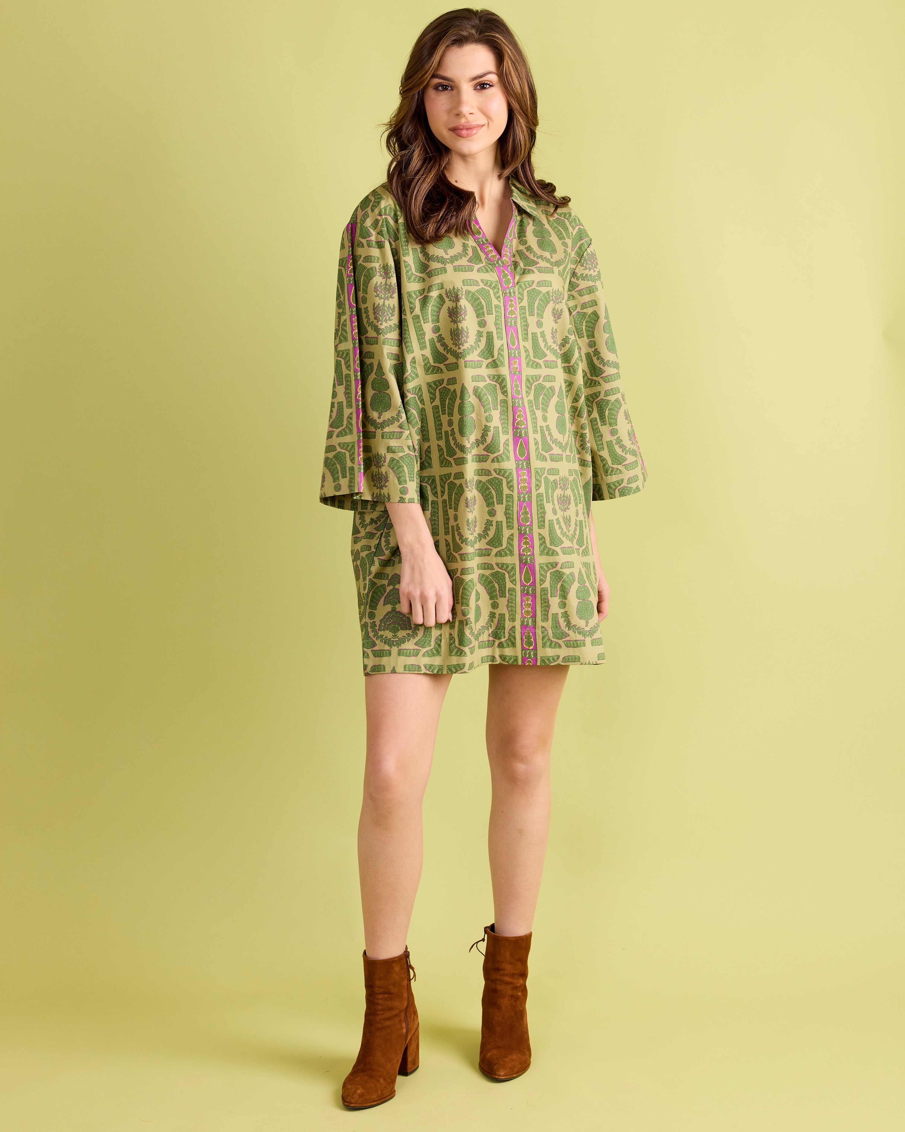 Classic elegance with a modern twist—the Colette Dress is designed to stand out. This relaxed shift silhouette features wide sleeves, a split neckline, and bold geometric-inspired patterning in fresh shades of green with a pop of magenta trim. Effortlessly chic and comfortable, the Colette is perfect for everything from daytime gatherings to evening cocktails. Style it with boots or flats for a polished look that’s equal parts sophisticated and easy to wear.