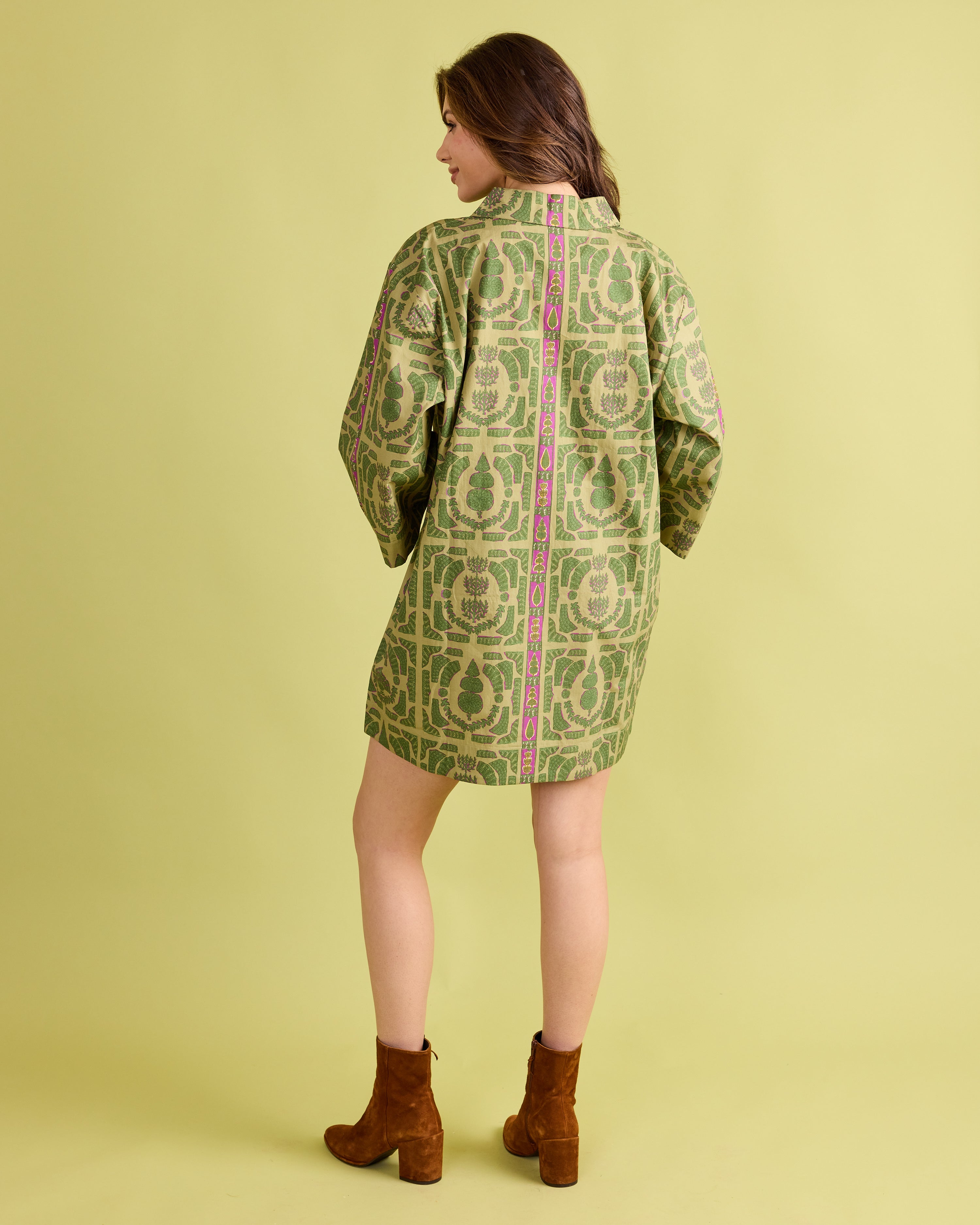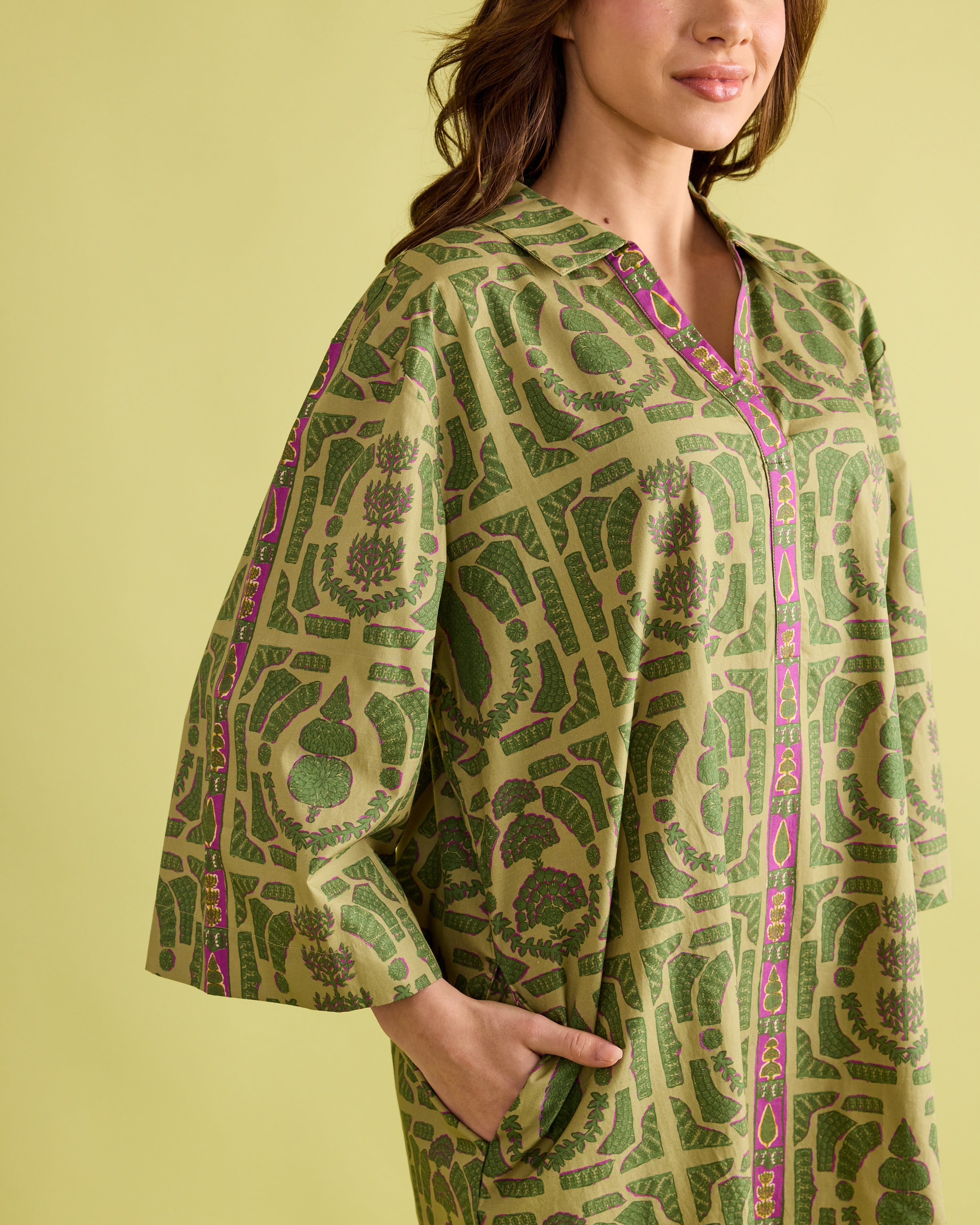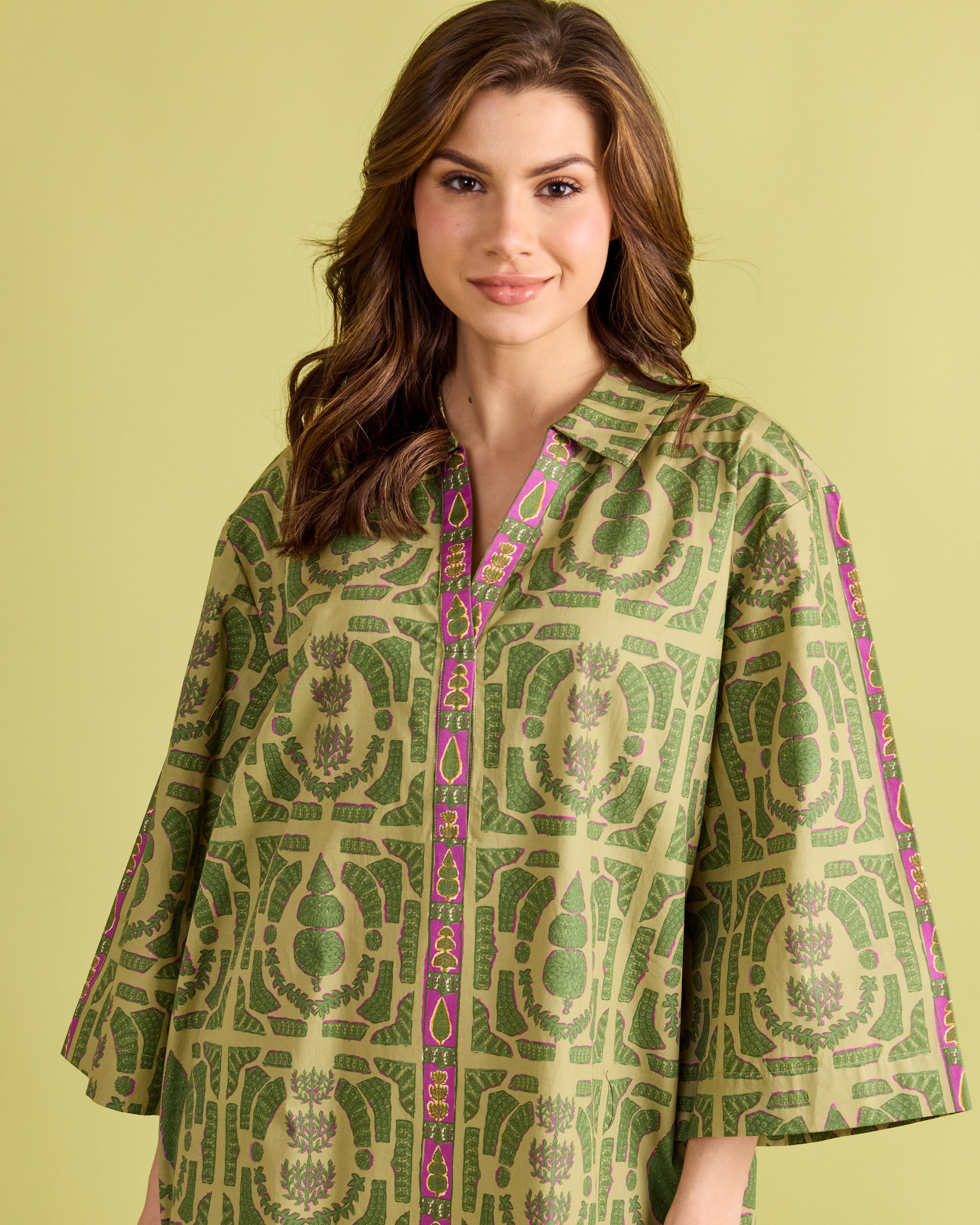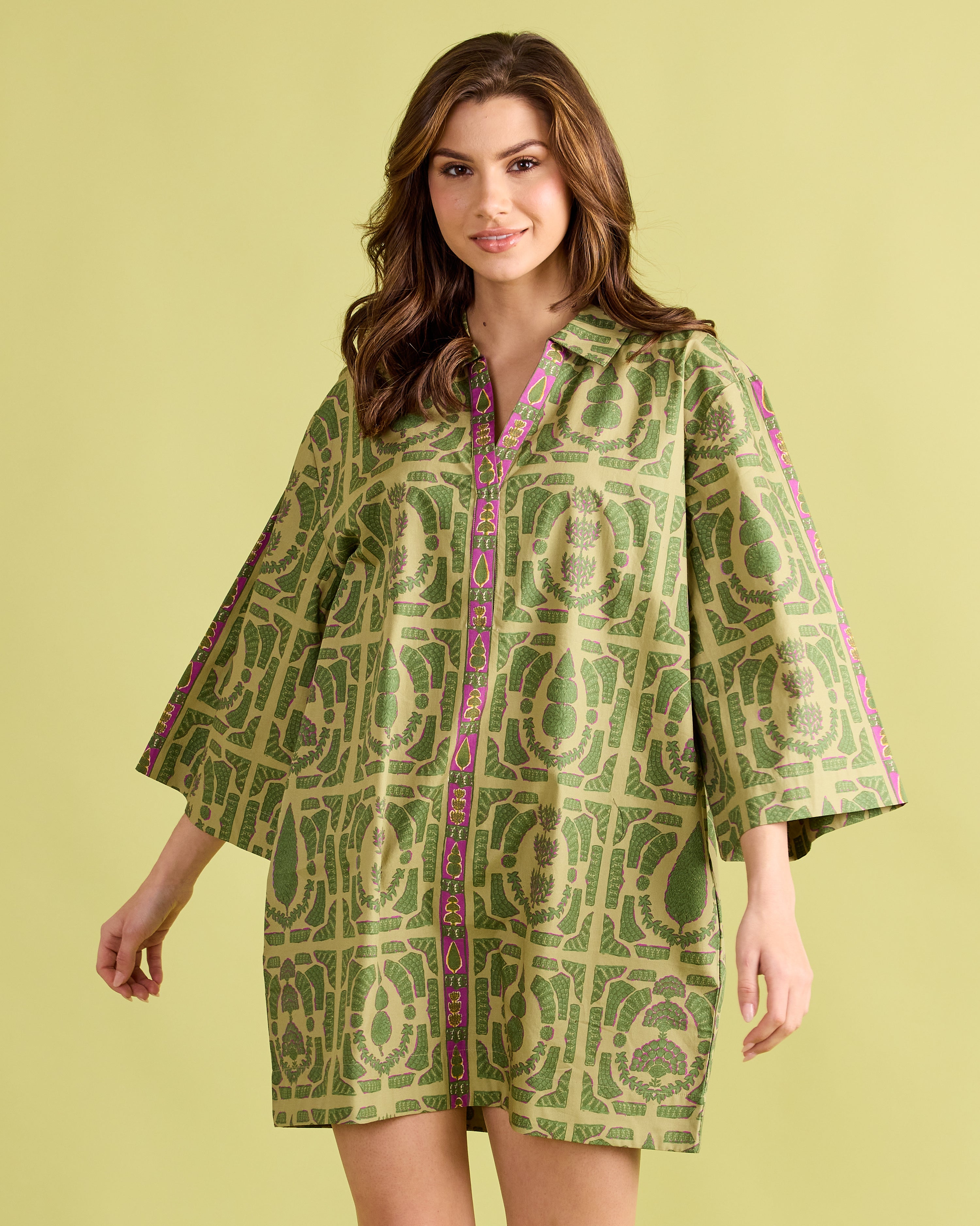 Classic elegance with a modern twist—the Colette Dress is designed to stand out. This relaxed shift silhouette features wide sleeves, a split neckline, and bold geometric-inspired patterning in fresh shades of green with a pop of magenta trim. Effortlessly chic and comfortable, the Colette is perfect for everything from daytime gatherings to evening cocktails. Style it with boots or flats for a polished look that’s equal parts sophisticated and easy to wear.