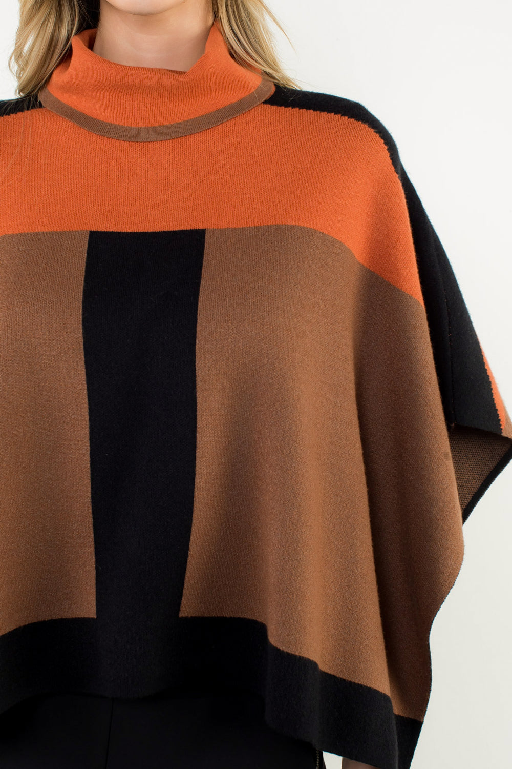 Add a touch of modern sophistication to your cool-weather wardrobe with this colorblock poncho sweater. Designed with a relaxed, draped silhouette and chic mock neckline, this piece blends comfort with effortless style. The warm tones of rust, camel, and black create a striking geometric pattern, perfect for pairing with tailored shorts or slim pants for a polished fall look.