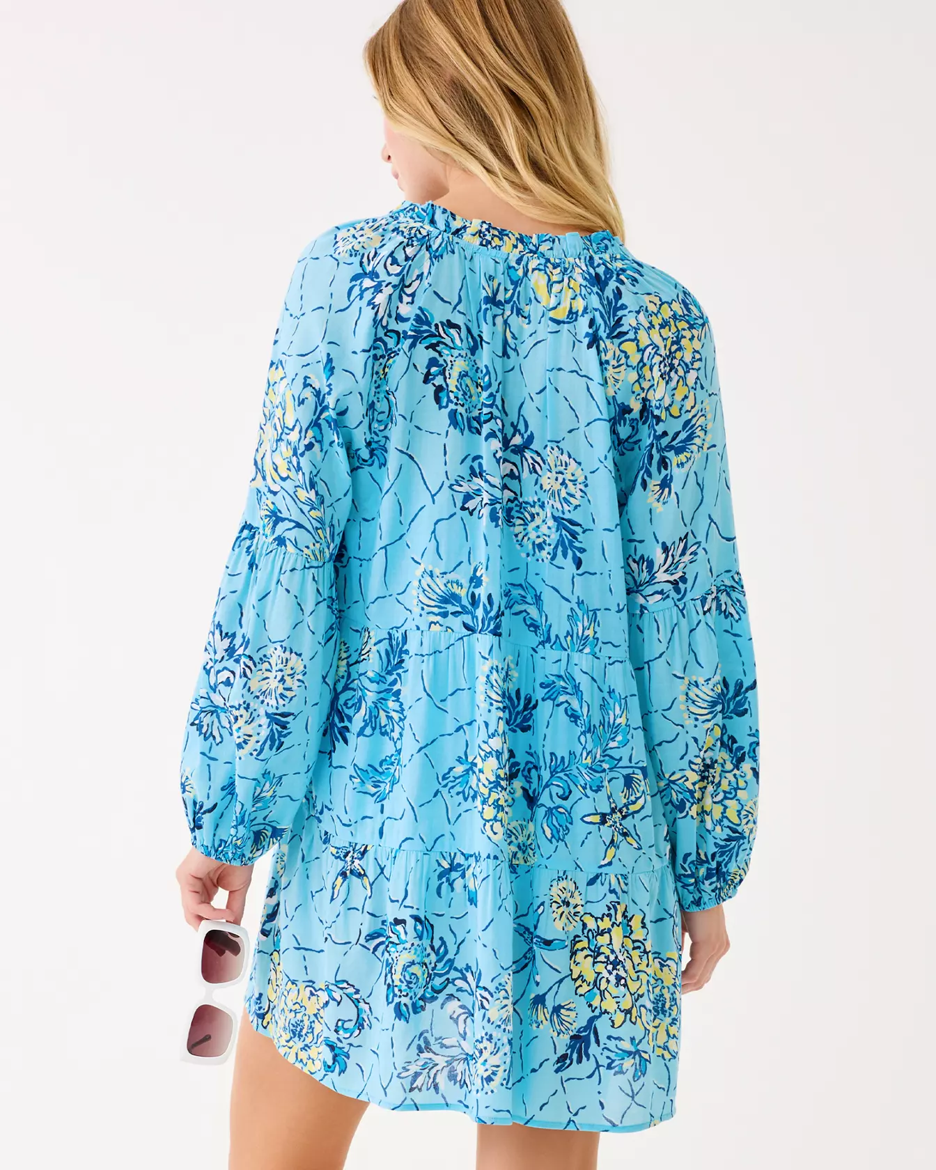 - Easy fit, long sleeve cover-up with a ruffled notch neckline and tiers throughout the body and sleeves.