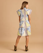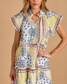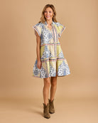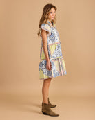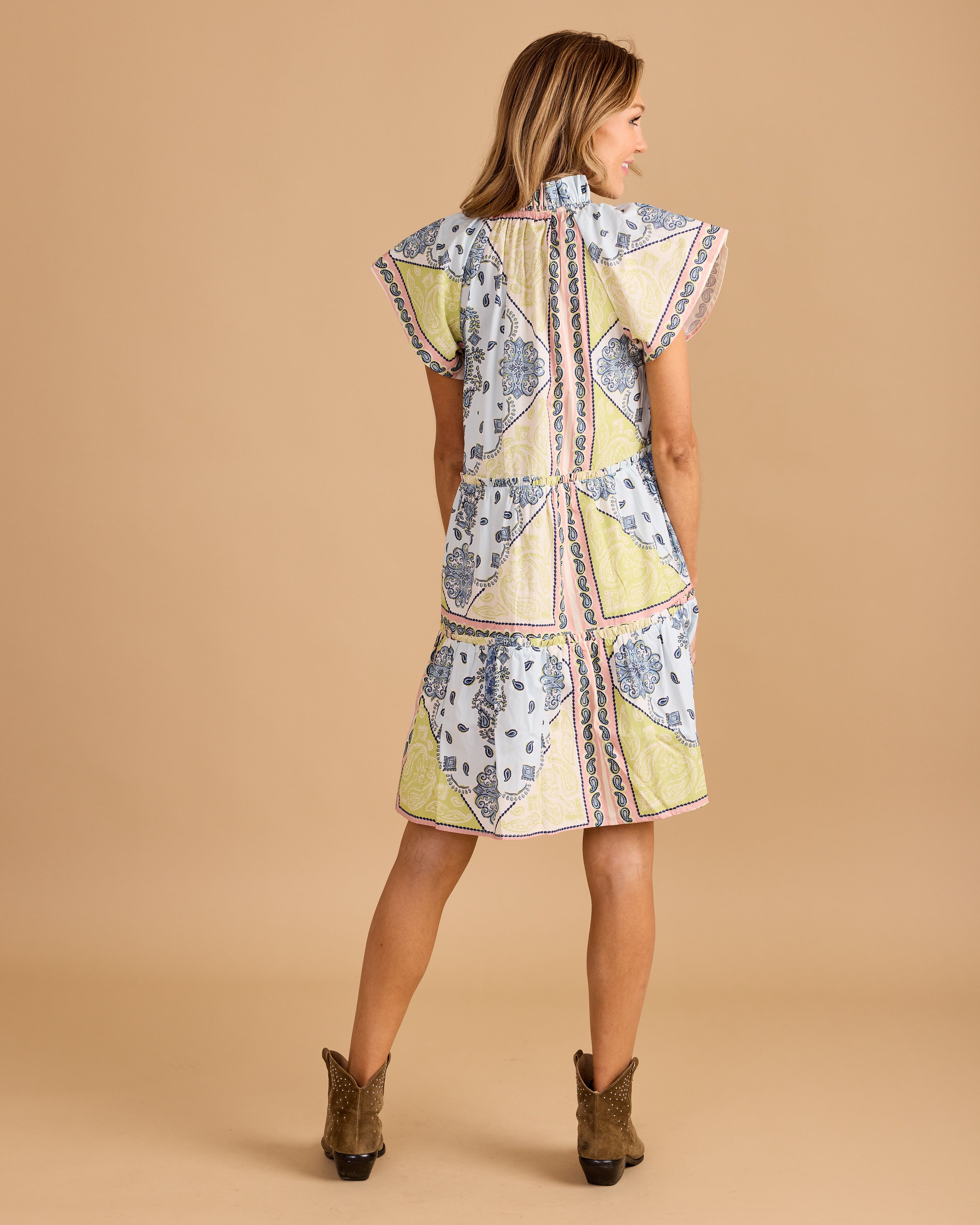Pastel bandana-print mini dress with flutter sleeves, a ruffled collar, and tiered silhouette. Easy, breezy, and perfect for sunny days.