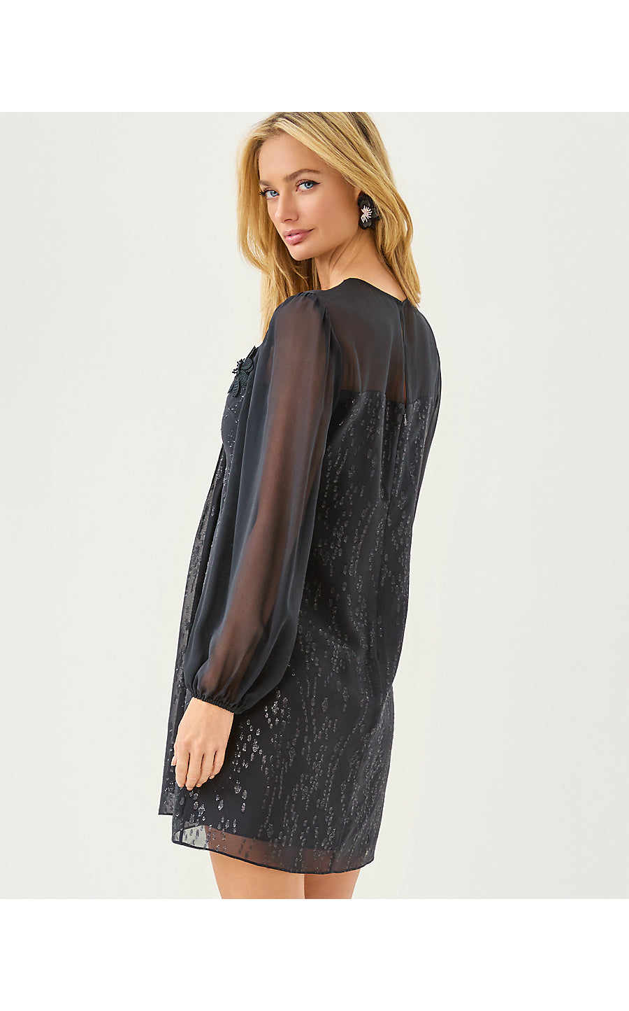 - Easy fit, long sleeve dress with a sheer yoke and sleeves, a front pintuck detail, and 3D Lilly lace applique.