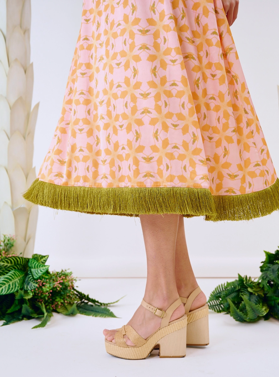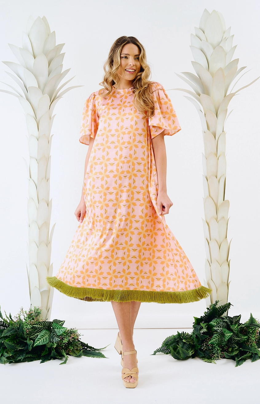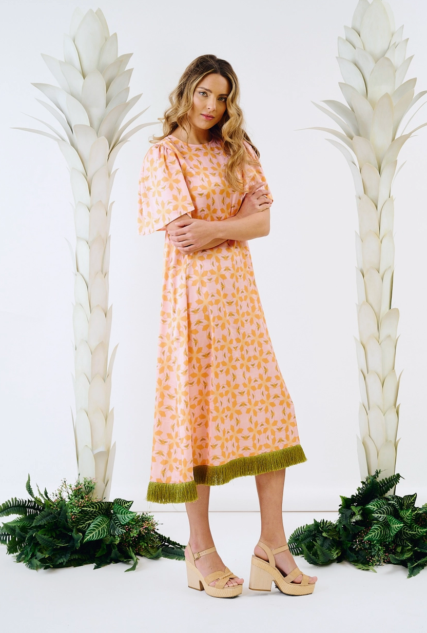 As easy as she is cool and sophisticated, our Georgia Dress features a free-flowing yet flattering A-line cut that gracefully falls to the ankle with bell sleeves that elegantly cover the upper arms. Crafted from a smooth poly/spandex blend and finished with an olive green fringe trim, this dress ensures you make a statement while enjoying all-day comfort. Details: - Crew neckline - Bell style sleeves - Fringe trim - Pockets - Center back zipper - Digitally printed with original prints - Packaged in a recycled plastic bag for protection FABRIC: 96% Polyester, 4% Spandex FIT: Runs true to size. - Size Small measures 51” in length and 37” in the bust. - Size Medium measures 51 and 11/16” in length and 39” in the bust. - Size Large measures 42” in the bust. - Size X-Large measures 45” in the bust Care Instructions: Dry clean only.