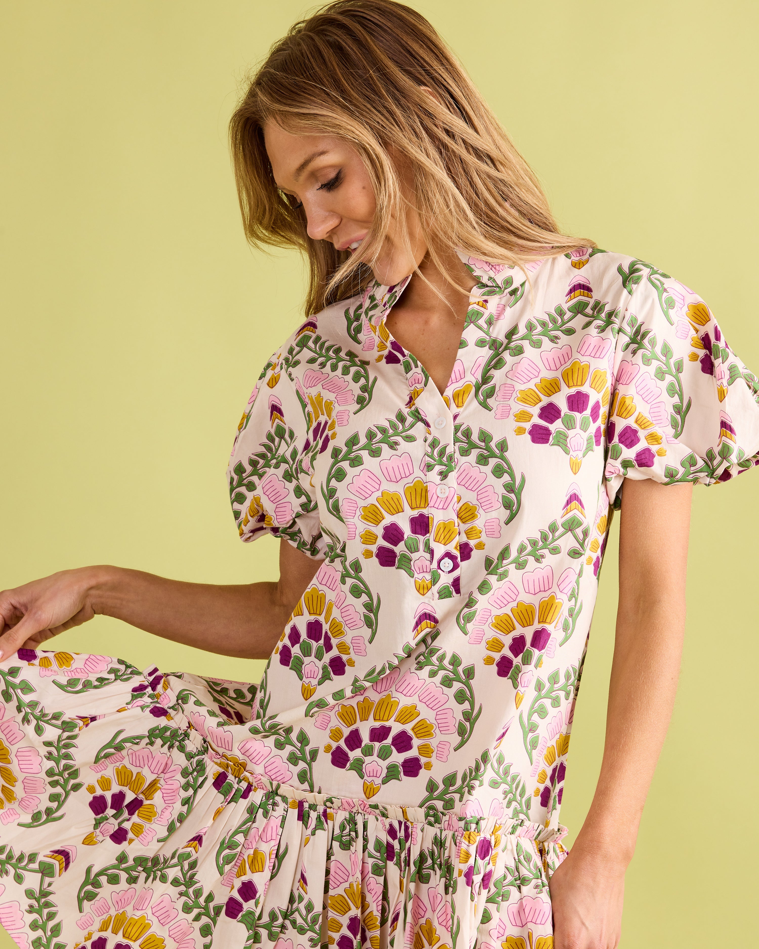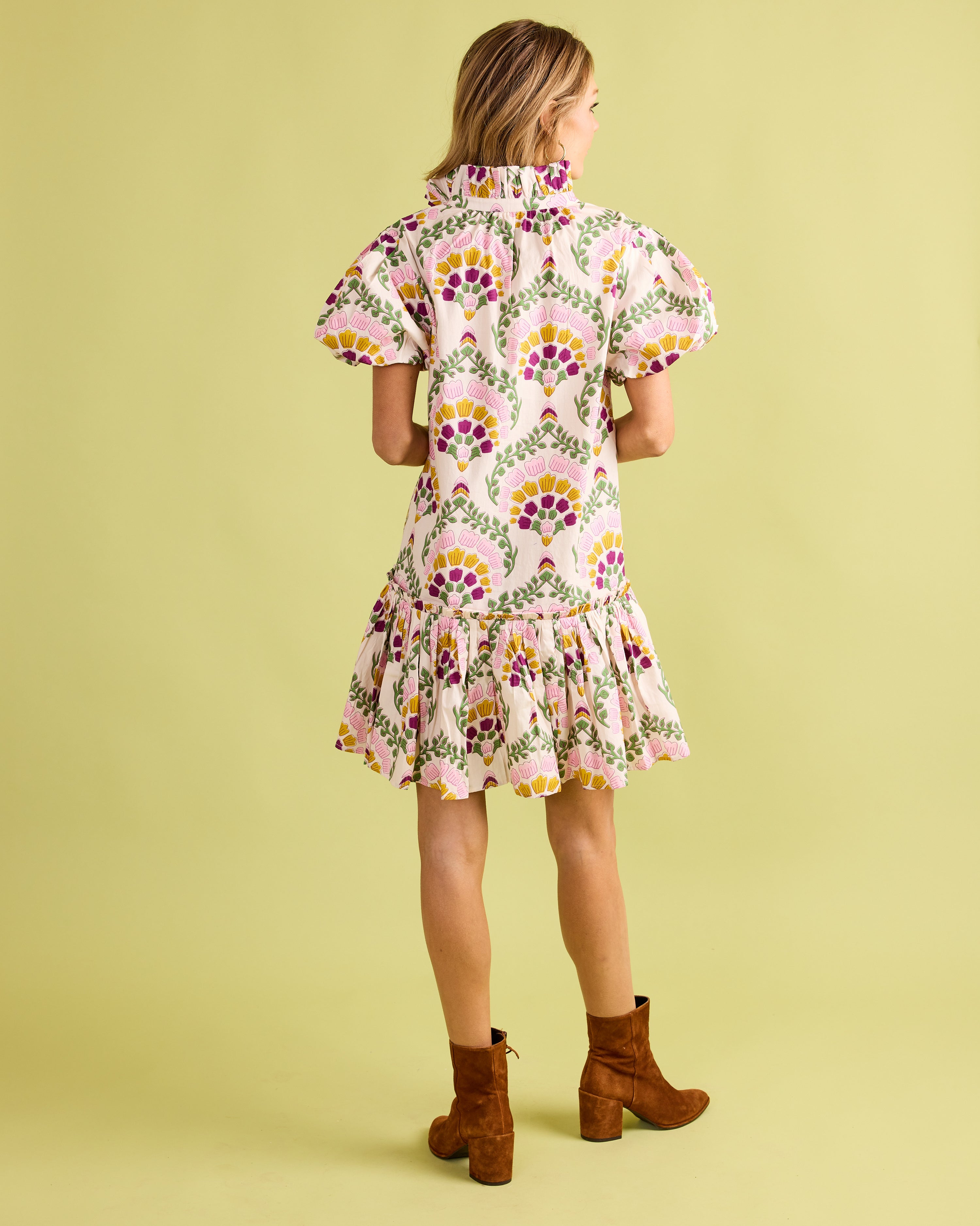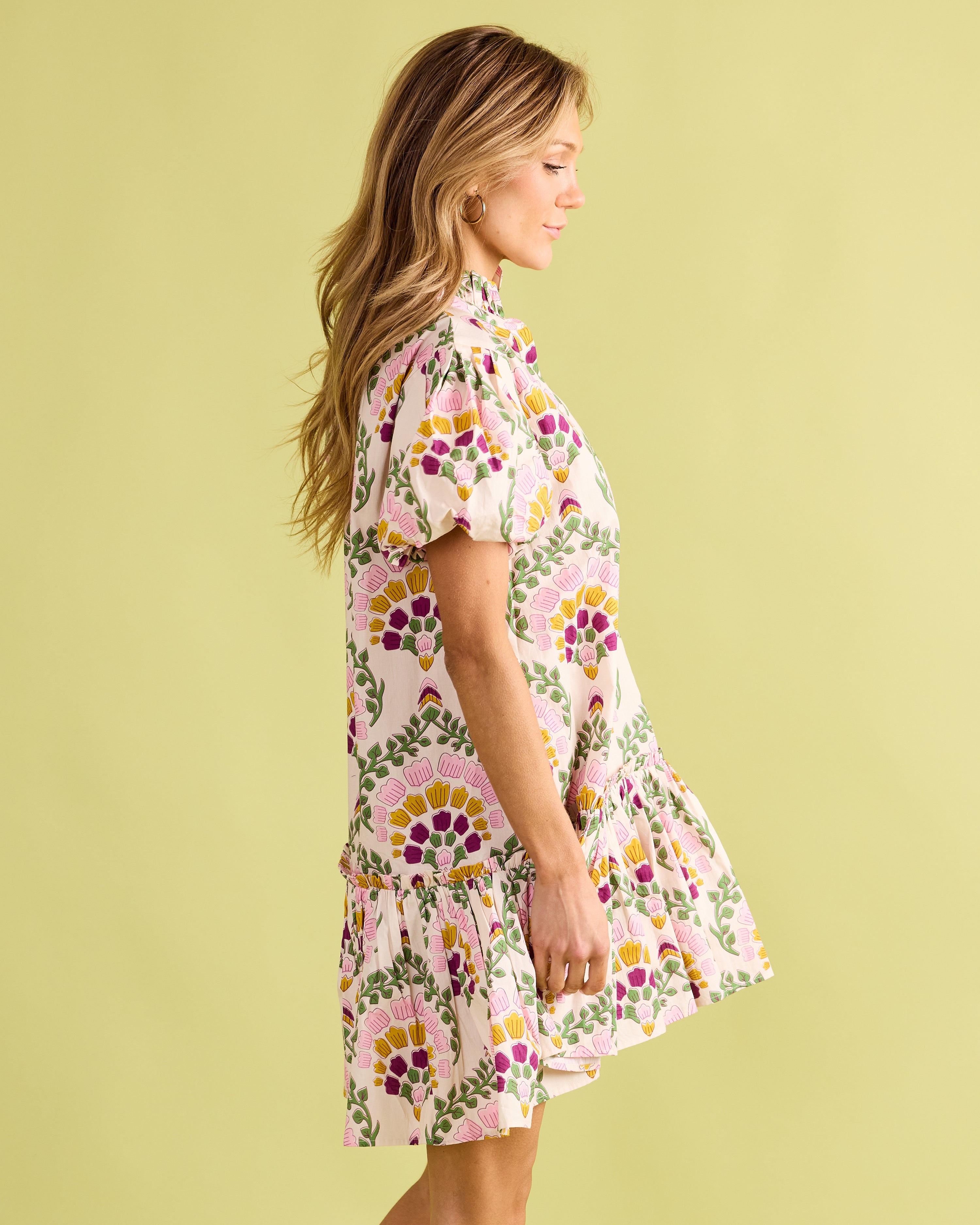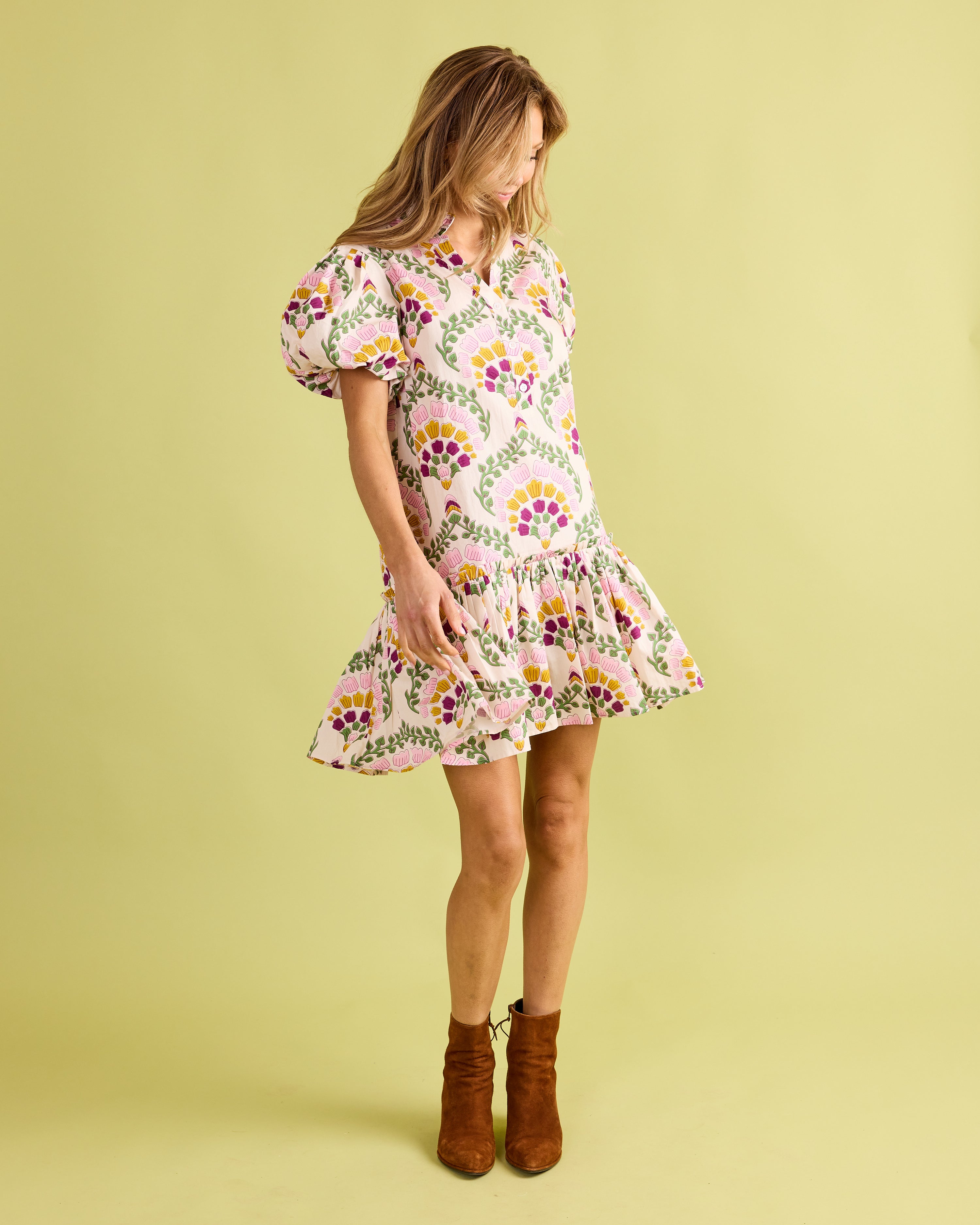 Fresh, feminine, and effortlessly chic—the Gia Dress is your go-to for any occasion. Featuring a playful drop-waist silhouette with voluminous short sleeves and a crisp collared neckline, this mini dress combines structure with ease. The bold floral print in shades of fuchsia, golden yellow, and green adds a vibrant pop against the soft ivory background. Pair it with boots or sandals for a look that transitions seamlessly from daytime outings to evening plans.