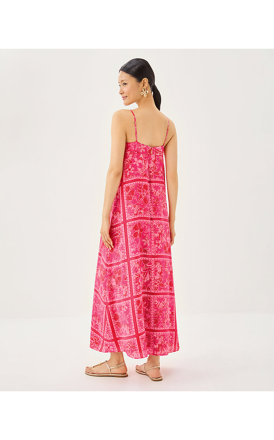 - Swing fit, square neck maxi dress with adjustable spaghetti straps and an interior shelf bra.