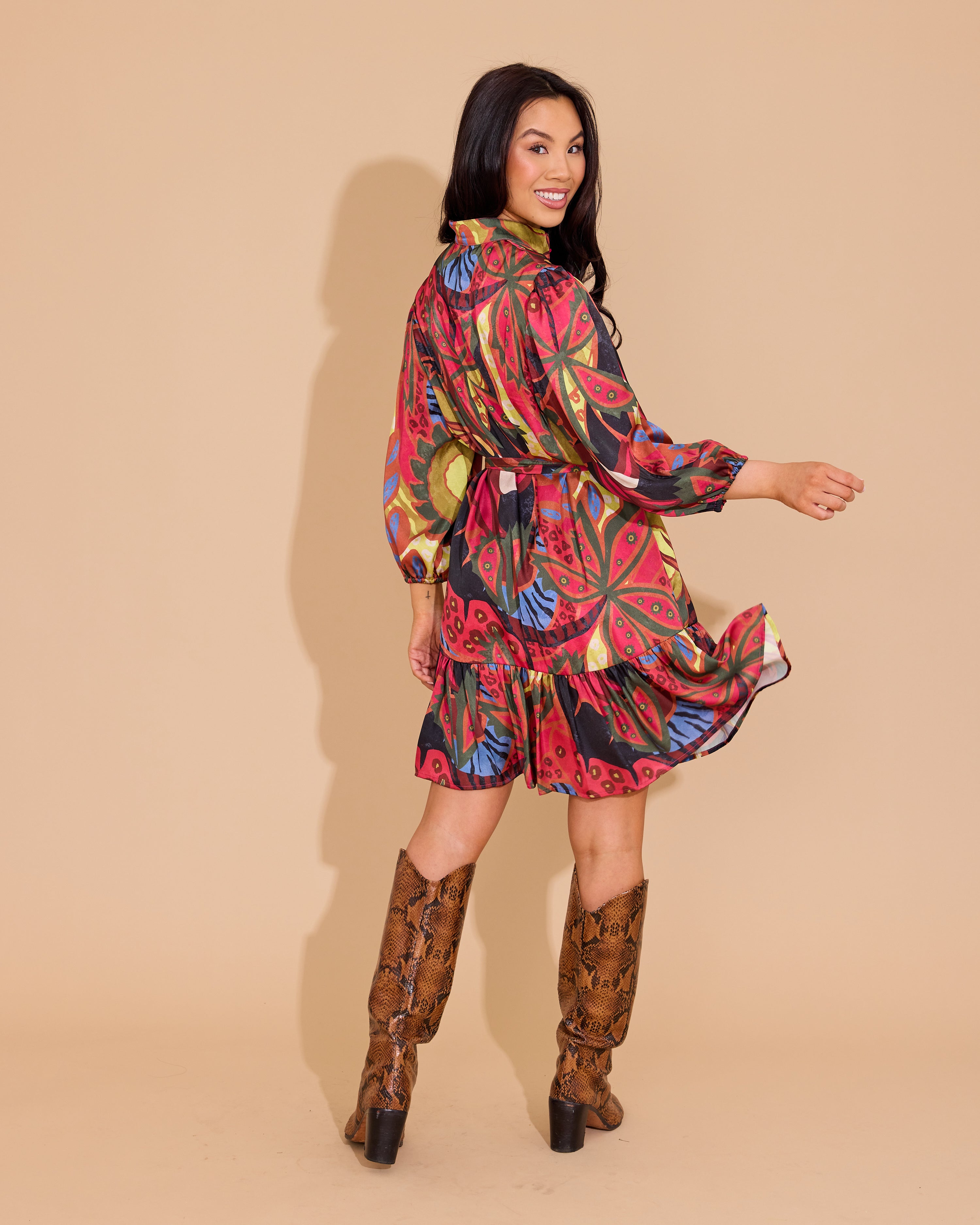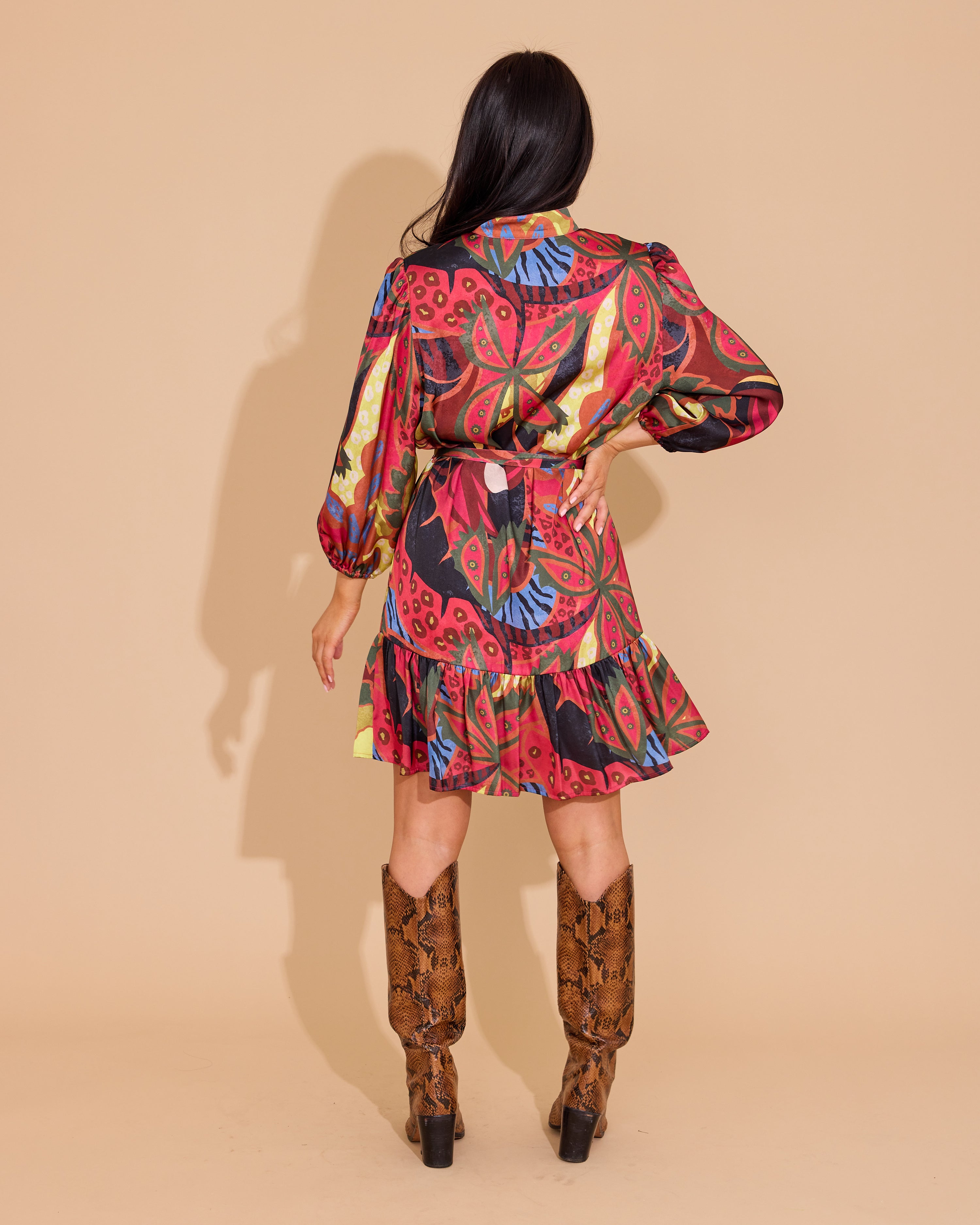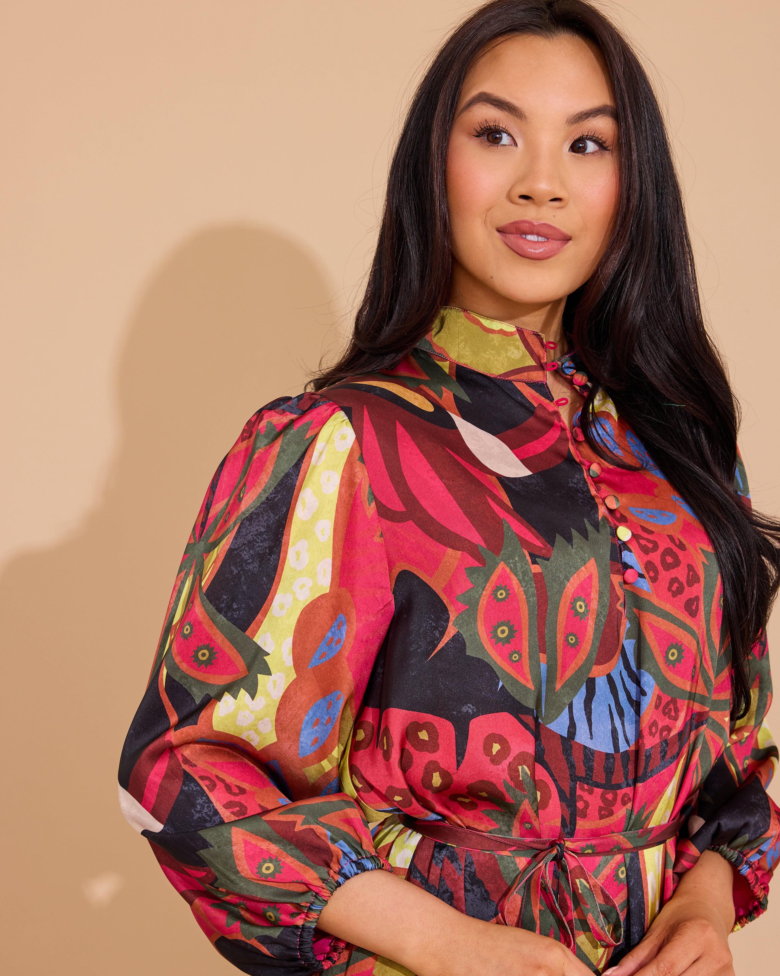 Bring bold energy to your wardrobe with the Presley Dress in our vibrant Jungle Floral print. Featuring a button-front neckline, billowy long sleeves with elastic cuffs, and a flattering tie waist, this dress is equal parts playful and chic. The tiered skirt adds movement and charm, making it perfect for everything from daytime outings to festive evenings. Pair it with boots for a statement look or heels for a more refined vibe.