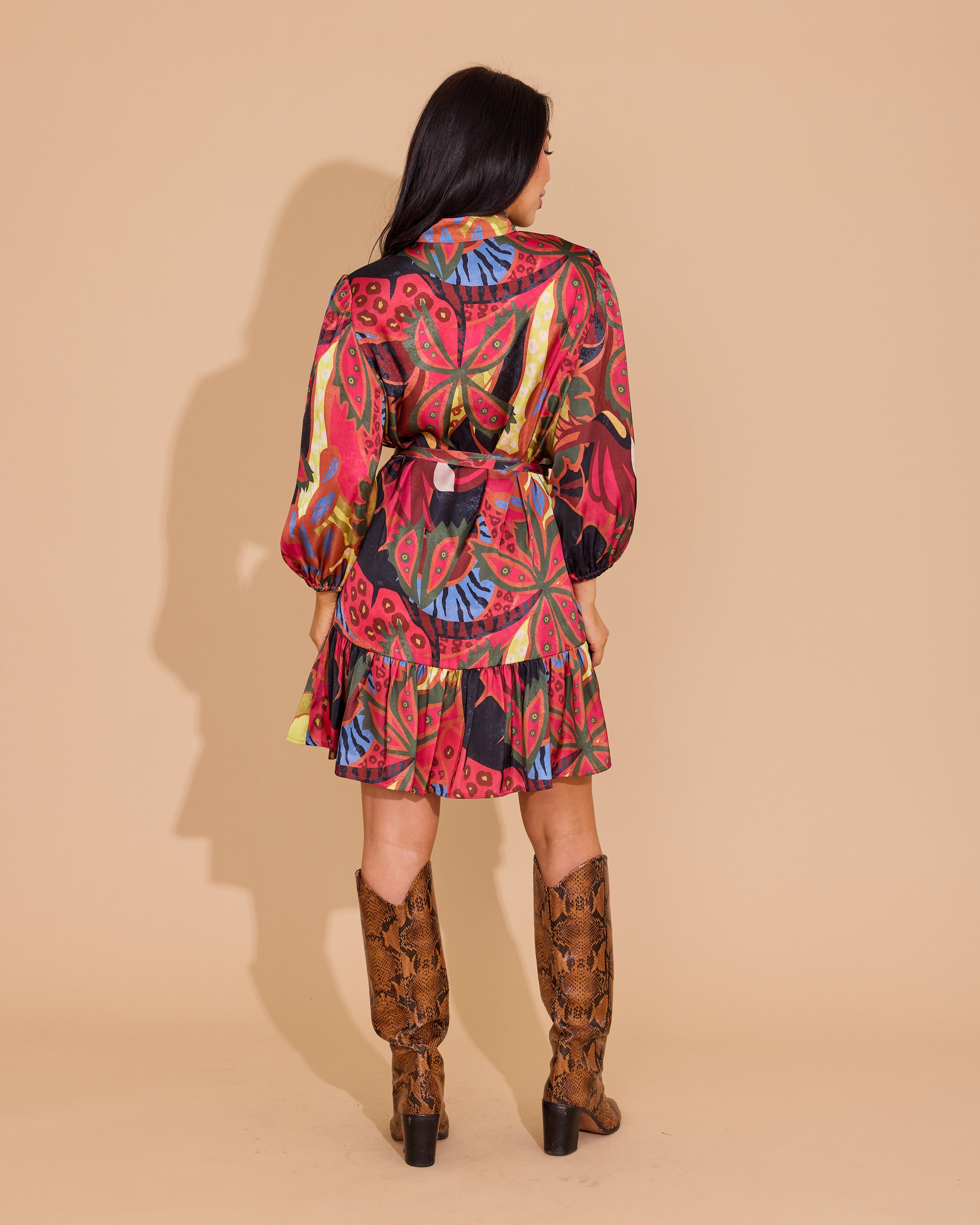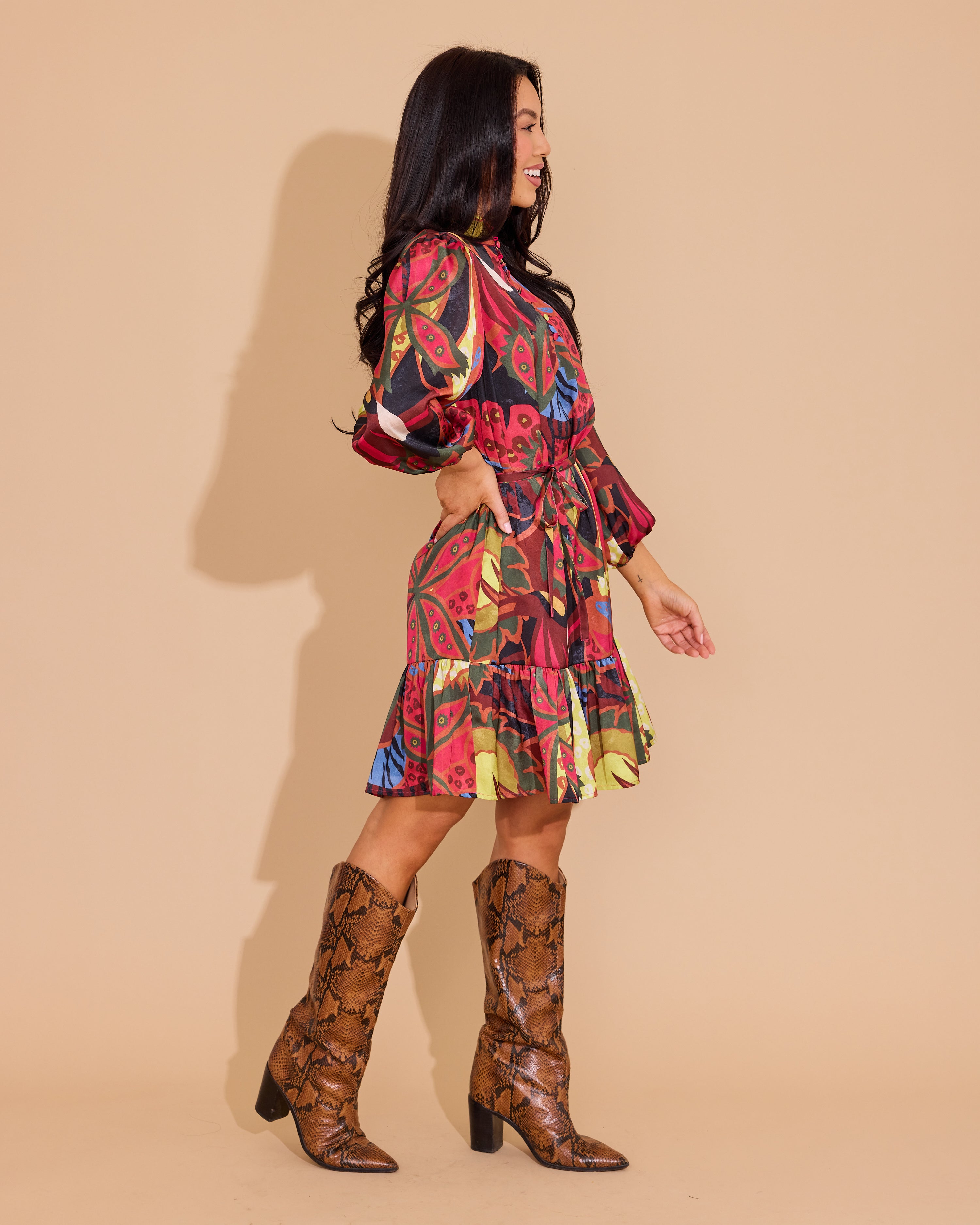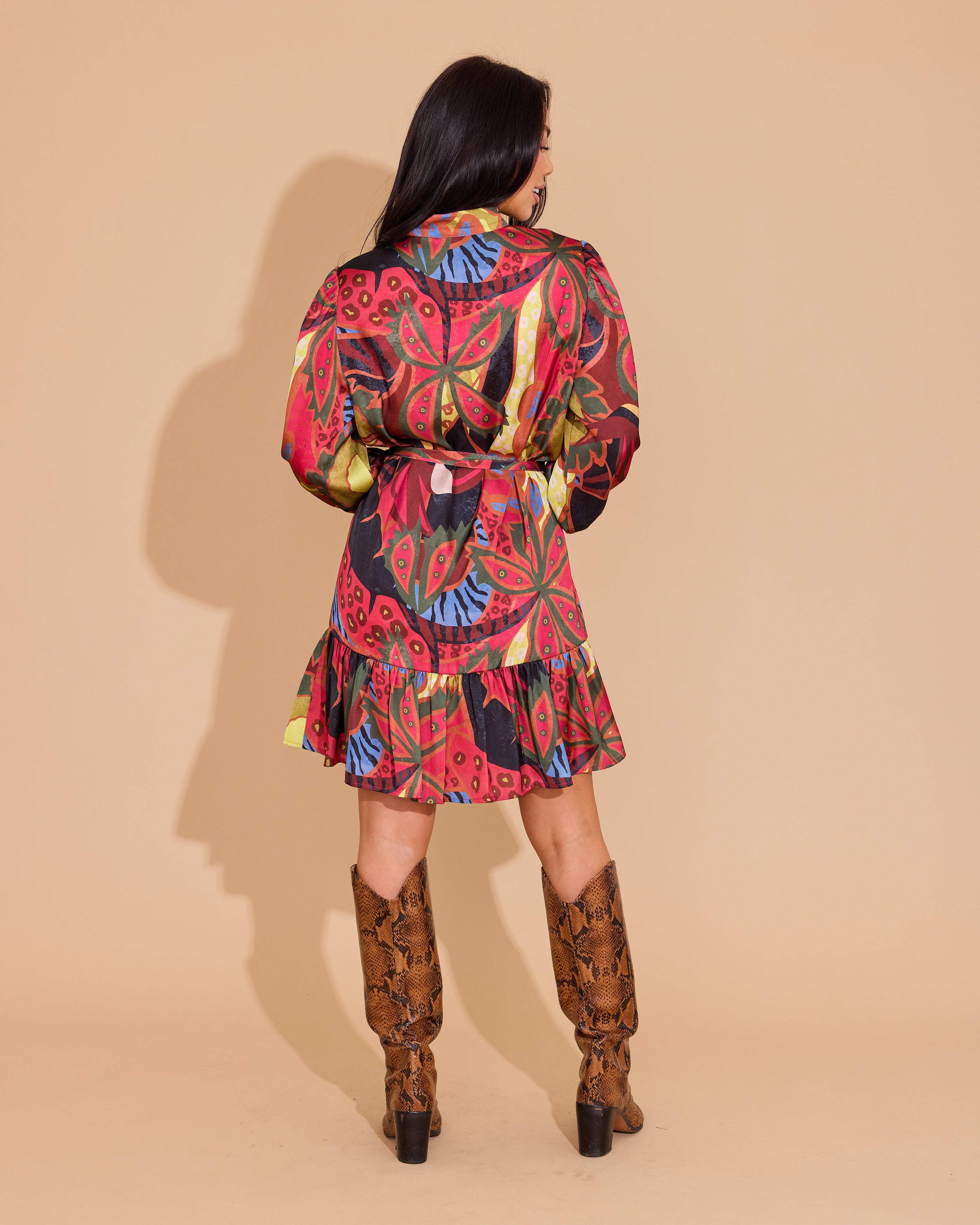 Bring bold energy to your wardrobe with the Presley Dress in our vibrant Jungle Floral print. Featuring a button-front neckline, billowy long sleeves with elastic cuffs, and a flattering tie waist, this dress is equal parts playful and chic. The tiered skirt adds movement and charm, making it perfect for everything from daytime outings to festive evenings. Pair it with boots for a statement look or heels for a more refined vibe.