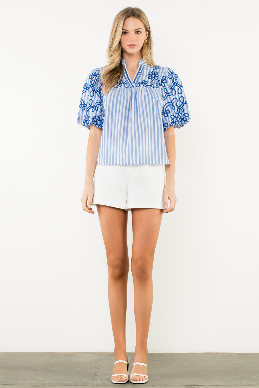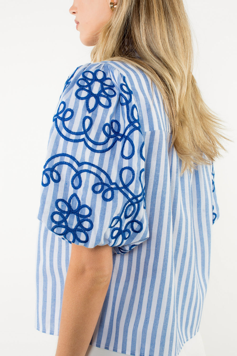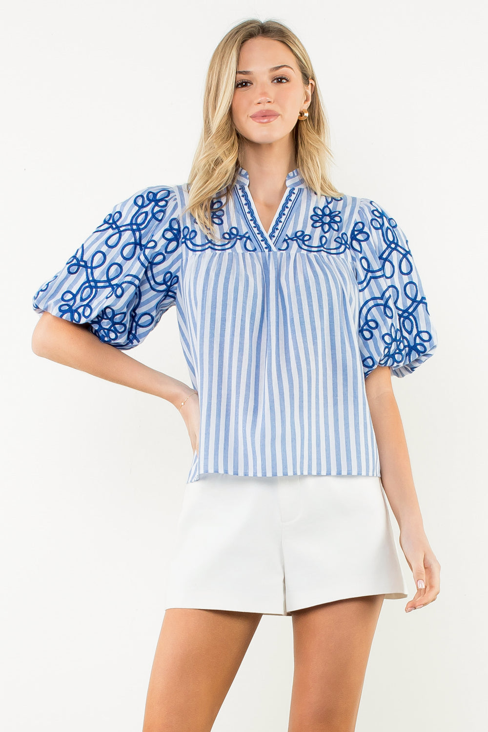This breezy blue and white striped top features playful embroidered sleeves and a flattering v-neckline. Perfect for sunny days and seaside strolls!