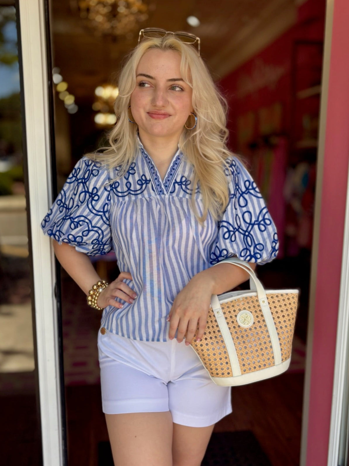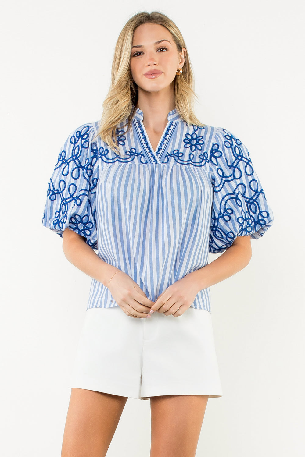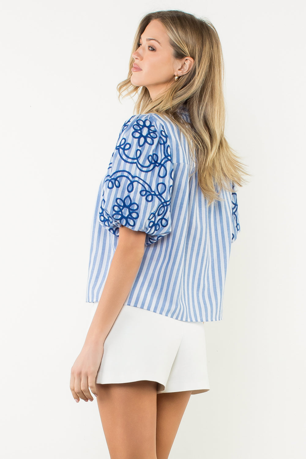 This breezy blue and white striped top features playful embroidered sleeves and a flattering v-neckline. Perfect for sunny days and seaside strolls!