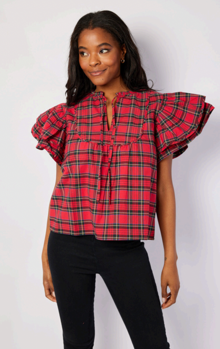 Classic plaid meets playful charm in this festive favorite. The Ruffle Sleeve Top features bold layered sleeves, a split neckline with tie detail, and a relaxed fit that’s as flattering as it is comfortable. The vibrant tartan plaid makes it a perfect pick for holiday gatherings, casual celebrations, or cozy nights in. Pair it with denim or velvet pants for an effortlessly chic seasonal look.