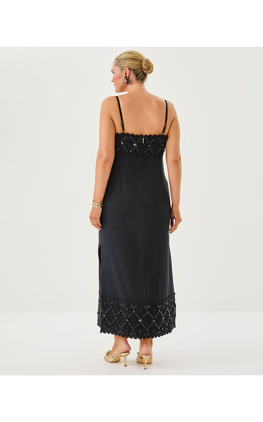 - Fitted, square neck maxi dress with adjustable spaghetti straps, bodice cups, side slits, and wide Lilly lace trim with beading.